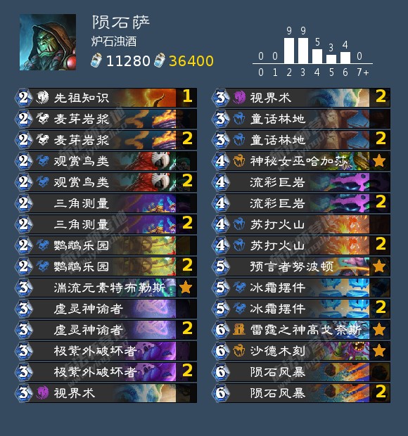 这应该是当前环境下陨石萨的最强版本,我称之为炎爆萨,相对于昨天分享的两套陨石萨,这套构筑根据环境替换了几乎一半的单卡,当前环境主流的元素萨,奥丁战,各种形态的DK,贼,都有着强势表现,今天从中午开始,到晚上11点,也是帮群里一名水友从黄金4打到传说2万名,全程直播打的,在群友的见证下,从刚开始的构筑一路更改过来,到现在这套最终的版本,这套构筑拿掉了摩摩尔,依辛迪奥斯等等许多卡手的牌,增加了视界术,先祖等过牌手段,也增加了火山,和新橙卡投影来苟活,彻底提高了整套卡组的上限。