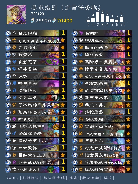 【1】强度:大优后期,尤其是龟龟卡组。实战中,由于本套牌费用曲线合理、发现定向牌极多,八费完成任务很容易。 【2】理想思路:丛林猎人赫米特开枪/档案管理员发现撕掉牌库所有法术牌,5费任务泽瑞拉+4费高阶修士+任一法术迸发,完成一回合内斩杀。此外,2费随从机械师有法术迸发定向检索4费高阶修士的功能。 【2.1】图2为非理想思路,只能排序过牌第二回合斩杀。【3】牛牛:环境针对牌即可。 【4】奇利亚斯:6费曲线补充。 【5】偏娱乐,谨慎合成。硬伤在于577有较大被破坏风险。