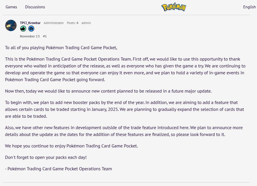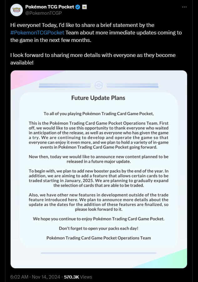 《宝可梦 TCG Pocket》官方发布更新计划 2025年1月推出交换卡牌功能