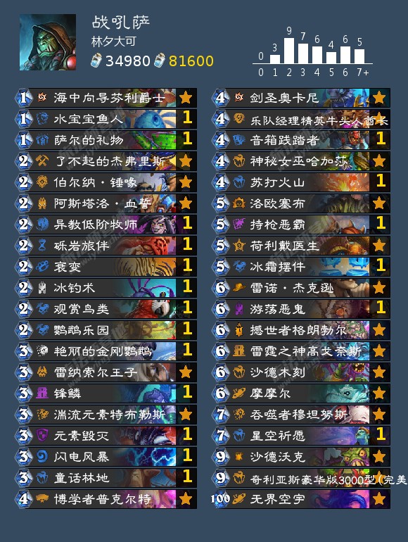 ### 宇宙战吼萨任务术专杀# 职业:萨满祭司# 模式:狂野模式## 1x (1) 水宝宝鱼人# 1x (1) 海中向导芬利爵士# 1x (1) 萨尔的礼物# 1x (2) 了不起的杰弗里斯# 1x (2) 伯尔纳·锤喙# 1x (2) 冰钓术# 1x (2) 异教低阶牧师# 1x (2) 砾岩旅伴# 1x (2) 衰变# 1x (2) 观赏鸟类# 1x (2) 阿斯塔洛·血誓# 1x (2) 鹦鹉乐园# 1x (3) 元素毁灭# 1x (3) 湍流元素特布勒斯# 1x (3) 童话林地# 1x (3) 艳丽的金刚鹦鹉# 1x (3) 锋鳞# 1x (3) 闪电风暴# 1x (3) 雷纳索尔王子# 1x (4) 乐队经理精英牛头人酋长# 2x (1) 冰冷贮藏# 1x (3) 艳丽的金刚鹦鹉# 1x (4) 剑圣奥卡尼# 1x (4) 博学者普克尔特# 1x (4) 神秘女巫哈加莎# 1x (4) 苏打火山# 1x (4) 音箱践踏者# 1x (5) 冰霜摆件# 1x (5) 持枪恶霸# 1x (5) 洛欧塞布# 1x (5) 荷利戴医生# 1x (6) 摩摩尔# 1x (6) 撼世者格朗勃尔# 1x (6) 沙德木刻# 1x (6) 游荡恶鬼# 1x (6) 雷诺·杰克逊# 1x (6) 雷霆之神高戈奈斯# 1x (7) 吞噬者穆坦努斯# 1x (7) 星空祈愿# 1x (0) 奇利亚斯豪华版3000型# 1x (0) 奇利亚斯豪华版3000型# 1x (4) 复制模块# 1x (5) 完美模块# 1x (9) 沙德沃克# 1x (100) 无界空宇# AAEBAaoIKPoOvBTDFva9AovOAqDOAqvnAu/3AvyjA8O2A/bWA6bvA4b6A9OABP2fBOWwBMeyBJfvBOKkBf3EBa3pBY31Bcj4BfmMBtCeBuihBsekBqelBqilBtSlBqSnBuupBoG4BsO+Bs7ABtDABtHQBq3hBqHiBqrqBgAAAQTTgAT9xAX1swbHpAb3swbHpAbo3gbHpAYB6aMF/cQFAA==# # 想要使用这副套牌,请先复制到剪贴板,然后在游戏中点击“新套牌”进行粘贴。