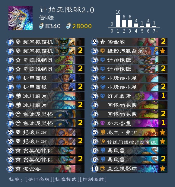 去掉了露娜和星域戒卫,加入了双淘金克,保证了计拍抽计拍或者地标的稳定性,忙碌的苦工有时候配合不到还占用一个卡位,换为了弗丁用来抽游客,以及计拍抽5费,战绩代码如下(传说探底)