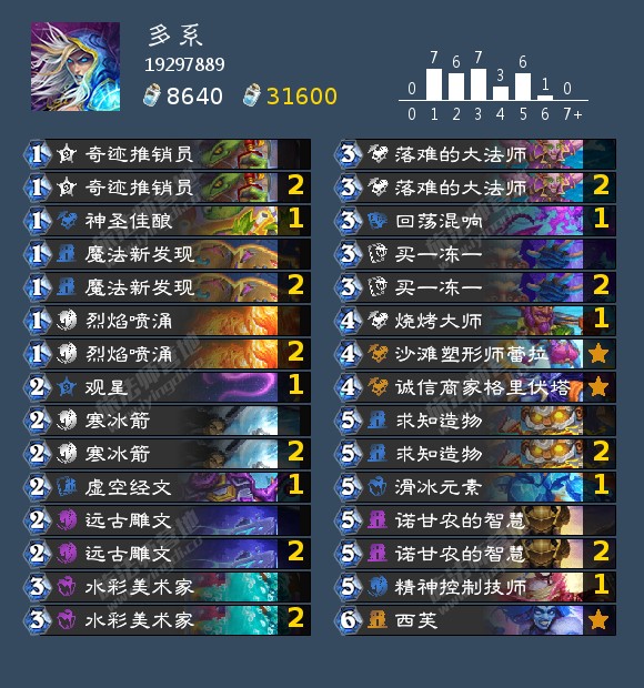 现在环境开始多样化了起来,但是中速慢速居多,我从版本更新开始就一直在测试多系法的构筑。也听了很多老哥的意见,边打边改,终于改出一套比较满意的,基本什么都能打,这卡组比较劣大哥德。大概64开,但是如果双滑冰在手可以73开,天胡打不过,快攻抗性也很高,卡组灵活卡位比较多,可以根据环境修改。格里伏塔(卖荔枝的)是一个上限很高的卡,第一优先级是减费,这样就算两买一冻一全射手也能高爆发启动。落难的大法师这卡很好用,可以嫖节奏。如果解不掉可以配合蕾拉4费铺一波,有的时候胡起来都不需要西芙斩杀,铺场都能铺死。现在从传说27万打到了12万,卡组还在持续更新中。。。