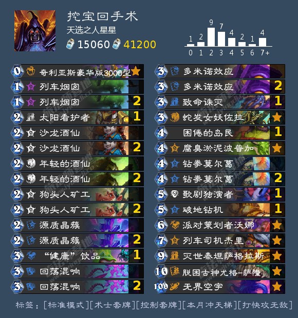 大家好,月初上传说还顺利吗?是不是被快攻打爆了?那么你就需要我这套卡组了,目前打海盗萨和各类快攻胜率能有90,打慢速卡组也有60胜率,唯一怕的就是节奏卡组,比如会玩的虚灵巨人贼。说一下卡组思路。首先,常见的轮盘术,目前可谓是胜率垫底,操作难度大,且惧怕快速卡组和节奏卡组,一般只欺负下奥丁战,因此构筑时候为了搏一搏带上了林恩,但是实际想靠疲劳胜利目前极其艰难,谁还没有鸡蛋呢。所以林恩只是娱乐作用,胜率堪忧。收到打过的宇宙挖宝战启发加入了挖宝体系。之后经过多次实战调整有了现在的卡组,接下家说一下起手留牌和对战思路。对战海盗萨等快攻卡组,起手留多米诺,剩下注意留低费,注意不要留晶簇。回手体系可以回手战吼和芋泥。二费的酒仙不用留,直接拍。对战各类慢速卡组,留晶簇,适当抽牌,酒仙要留,配合宝藏蛇进行真实伤害的斩杀,实战中打死过几十甲的星舰贼和防战,血被抽光有甲也是死。对战中速卡组,尽量留挖宝体系,依靠场面优势抢死对面,宝藏随从和法术质量都还可以,强度够用。下面是卡组:### 挖宝术# 职业:术士# 模式:标准模式# 天马年## 2x (1) 列车烟囱# 1x (2) 太阳看护者# 2x (2) 年轻的酒仙# 2x (2) 沙龙酒仙# 2x (2) 源质晶簇# 2x (2) 狗头人矿工# 1x (3) “健康”饮品# 2x (3) 回荡混响# 2x (3) 多米诺效应# 1x (3) 致命诛灭# 1x (3) 蛇发女妖佐拉# 1x (4) 困倦的岛民# 1x (4) 腐臭淤泥波普加# 2x (4) 钻拳莫尔葛# 1x (5) 歌剧独演者# 1x (5) 破地钻机# 1x (6) 派对策划者沃娜# 1x (7) 列车司机杰里# 1x (0) 奇利亚斯豪华版3000型# 1x (0) 奇利亚斯豪华版3000型# 1x (4) 复制模块# 1x (5) 完美模块# 1x (9) 灭世泰坦萨格拉斯# 1x (10) 脱困古神尤格-萨隆# 1x (100) 无界空宇# AAECAeiKBw6W1ASBrQWt7QX6+QWm+wXQgwaplQaAngbHpAanqAauwAaoygaTywaq6gYInKAE8YAGyoMG2JgG75sGo6AG+KMGlbMGAAED9bMGx6QG97MGx6QG7t4Gx6QGAAA=# # 想要使用这副套牌,请先复制到剪贴板,然后在游戏中点击“新套牌”进行粘贴。