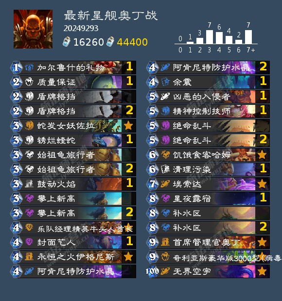 绝对是目前最强的一套战士卡组,我也是抄b站UP主的,亲测好用 讲一下思路tips 1.打萨满等一些快攻卡组,一定要留低费嘲讽,535恶魔一定要留,如果是萨满可以把软也留下(小行星萨打不了,基本必输)2.打大哥德要留130和无面,后手攀上新高不要跳币打(大优对局)3.战士内战靠炸弹赢,起手要把牛留着,里面有炸弹,可以佐拉复制炸弹4.打贼只能靠脏鼠拉他的关键牌5.发现猎比较恶心,后手的硬币别打,测他奥秘用