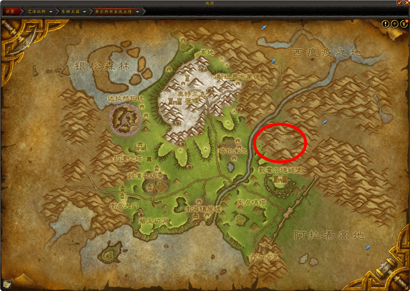 拉文霍德庄园所在位置-艾泽拉斯东部王国·希尔斯布莱德丘陵中红圈标注的位置