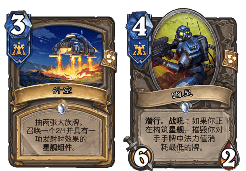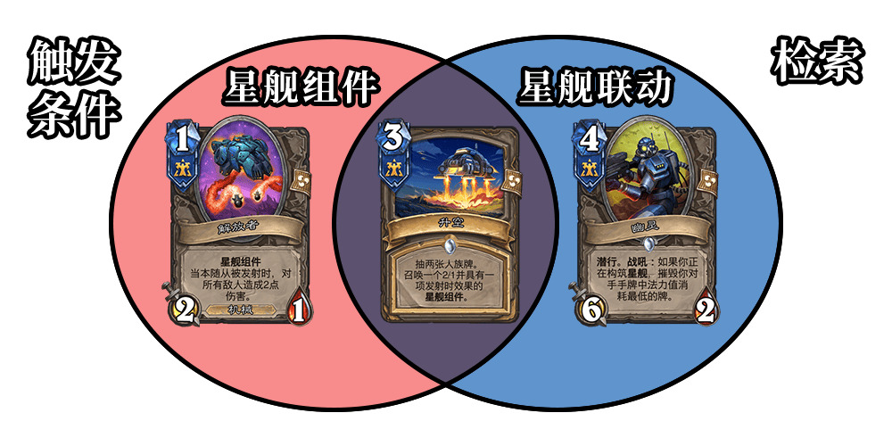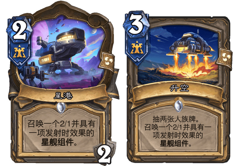 在有了同时提供触发条件和检索的升空后,人类阵营的星舰思路其实是能像双水晶学检索双奥尔多侍从那样,直接把检索牌当关键牌用了。这样的思路反而是排挤其他符合检索条件的牌的:不少薄圣契骑都放弃了乐器技师和圣礼骑士,来保证第一张水晶学能稳定抽双奥尔多侍从;历史上海盗战甚至有过双海盗藏品抽一张海盗之锚的情况。究其本源,对于很多卡组来说,如果稳定检索的收益足够高,第二张检索牌死在手里是可以接受的。