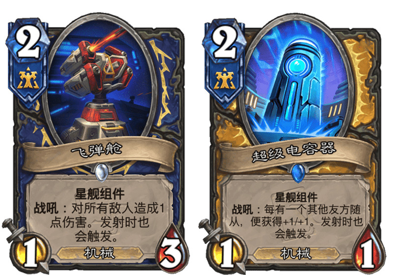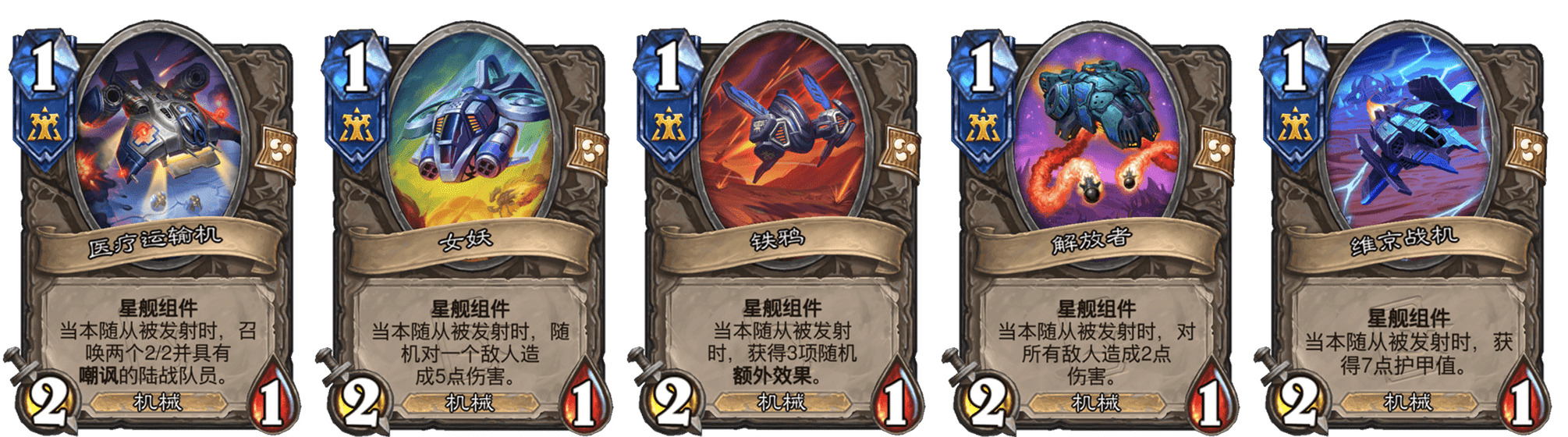 人类“中立”牌提供的星舰组件很统一:2/1的身材,同时发射时额外有3费左右的效果。不客气地说,狂野能真正用这些星舰组件的卡组应该是屈指可数的,但两张“星舰组件”牌基本都是踩在星舰思路的需求上了——他们能在足够低费的回合,造出满足“如果你正在构筑星舰”的小星舰组件。