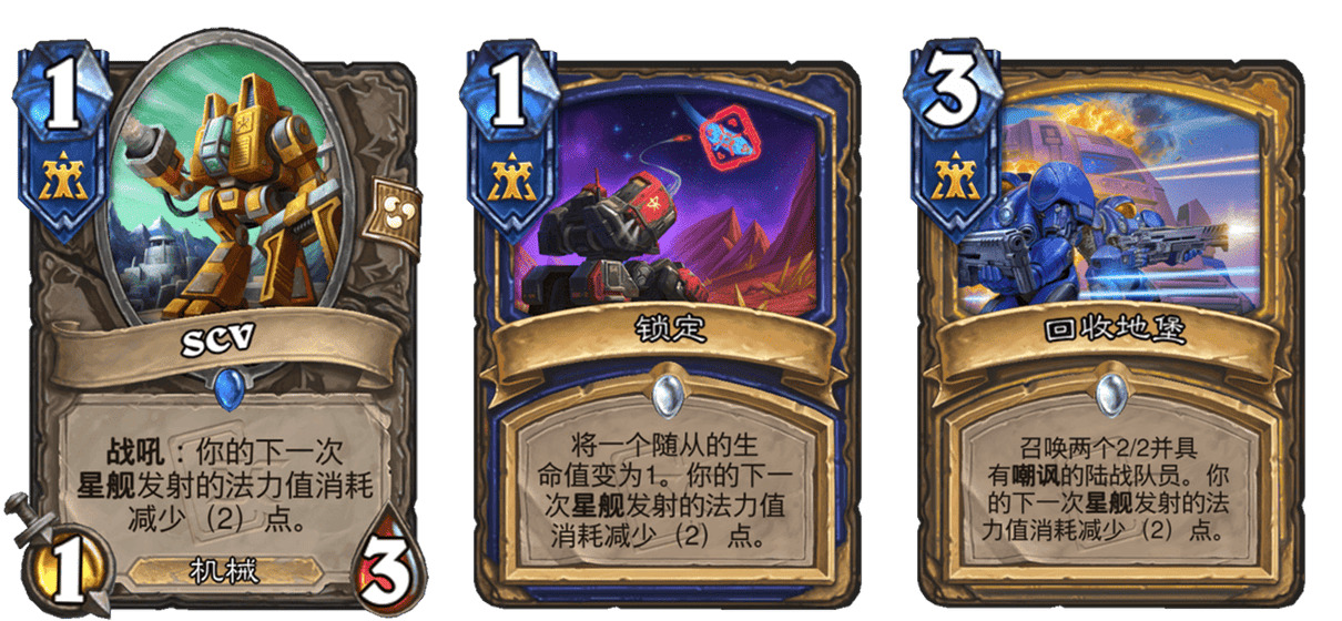 每个职业一张的减费法术和中立的SCV算是给人类阵营新卡开了一个好头,这些相对高效的存费和减费手段,对构筑思路的自洽是很有帮助的。目前来看,职业牌中的发射减费都是一张已有但不常用的法术牌的翻版(锁定-猎人印记;回收地堡-植树造林),且这张法术本身的效果能和星舰组件有配合,也和该职业的“职业特色”多少有些互动。