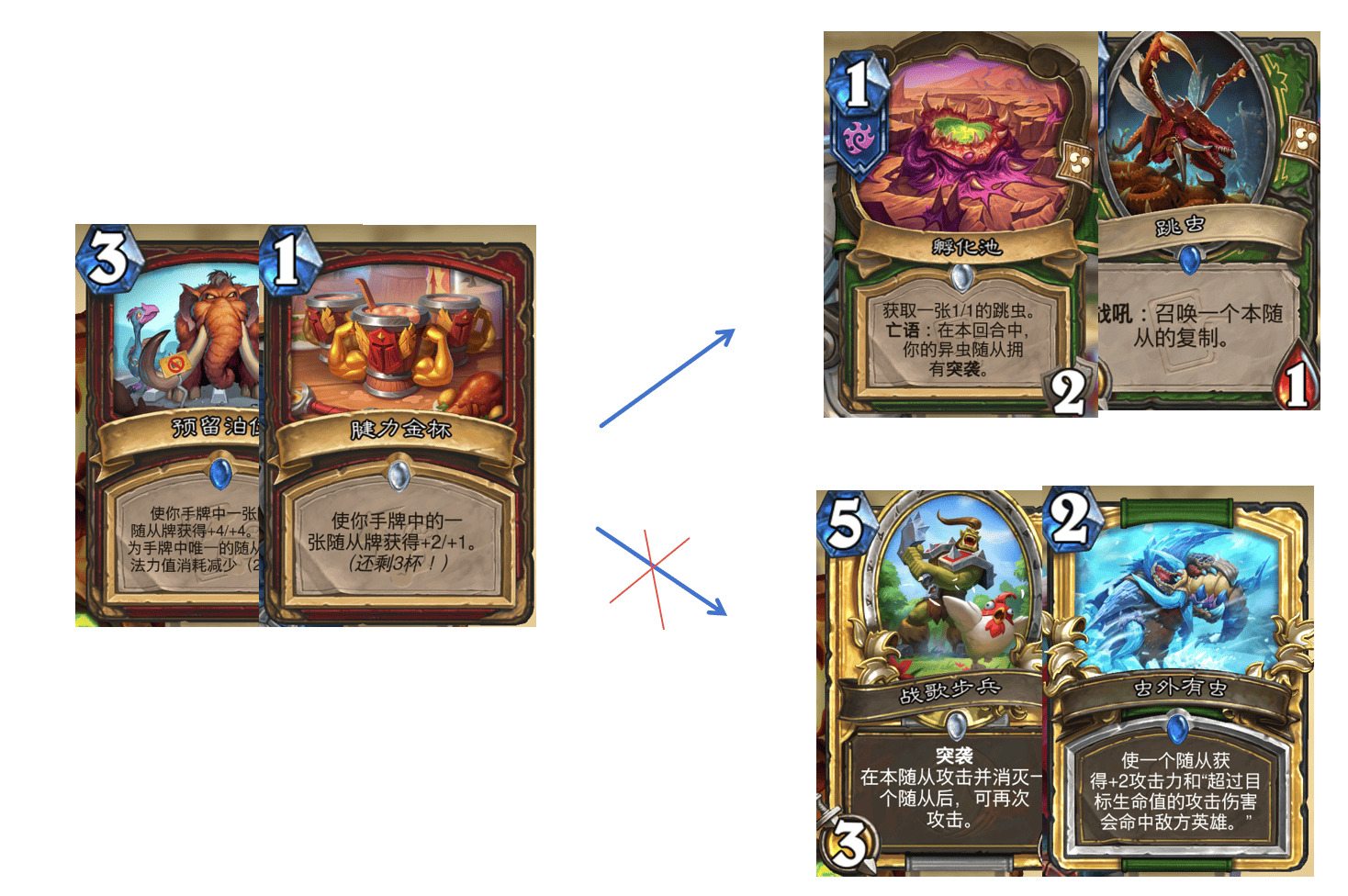 于是为了发挥buff的强势和增强卡组稳定性,有人尝试将步兵体系去掉而增加为迷你包中的跳虫体系。