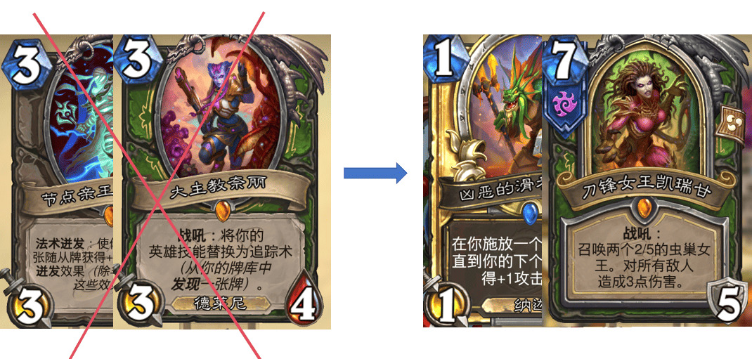 那么为了能够触发预留泊位的减费效果和金杯准确的buff作用,这套牌无法带过多的随从,避免射手而导致buff加歪的情况以形成极限快攻的效果,所以只能被迫放弃了后期补足资源的奈丽。而为了弥补中后期资源不足的情况,只能利用刀锋女王补足后续资源和伤害不足的情况。