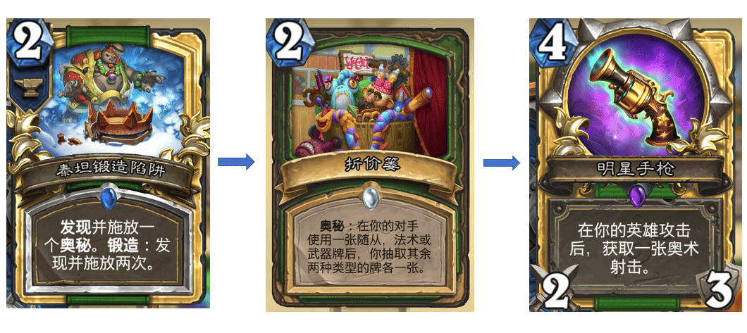 极限快攻体系的过牌一直都是一个令人担忧的问题,更何况是一个没有奈丽的猎人呢?但由于猎人本身奥秘的特殊情况,泰坦锻造奥秘陷阱在断牌的情况下发现折价篓是一个非常不错的抉择点,所以这套牌也是满编了奥秘陷阱来弥补中期可能断牌的缺陷,这也是为什么在这么多直伤当中选择了明星手枪的原因,也是为了配合折价篓能够稳定过刀而补足伤害。而在其他情况下打出陷阱,也能够干扰地方的抉择点从而保下场上的大跳虫。