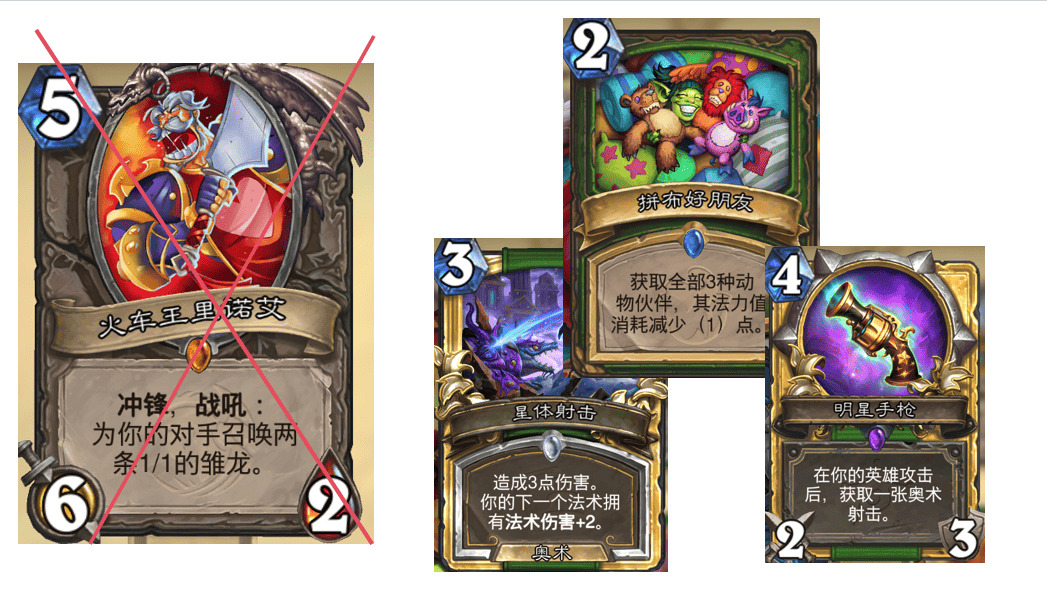 那这么看来污手体系围绕构筑已经成立的情况,可见的是后期资源在没有奈丽补足的情况下,只好成为极限快攻!其他卡位只能是作为直伤补组伤害了。火车王虽然是一个非常好的直伤卡位,但由于不能携带过多随从,火车王只好坐在冷板凳上了。而猎人就有非常多的弥补直伤的非随从卡,比如明星手枪、拼布好朋友、星体射击,这几张牌相互配合,让一个本身是污手体系的卡组拥有了随时转AD、AP双修的效果。