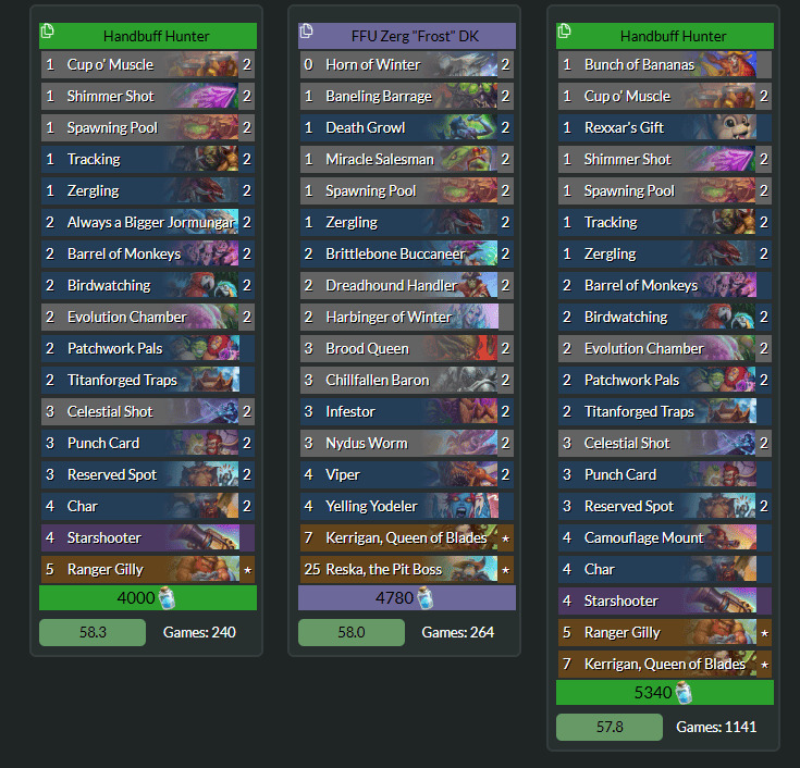 在半个月迷你包还没上线以前,我还是个污手萨、污手骑绝症玩家。但是当深谙领域迷你包上线以后,星舰萨、无限萨肆虐天梯,污手萨的强力奇利亚斯节奏和污手骑再大的怪都会被锁定和风怒刀轻而易举的解掉。也正因如此,步兵猎作为星舰萨和无限萨的天敌之一,即使它很吃牌序及其不稳定,但因为克制萨满的原因,其热度在补丁以前居高不下。上个月我自己也在天梯前1k的分段尝试了很多局步兵猎,但几局打下来,它的不稳定性让我对这套卡组彻底失望,甚至有被无限萨的脏鼠拉下以后基本没有赢点,于是我尝试优化卡组增加其稳定性,最具有标志性的就是参考了天梯前列的选手带了虫地标来过度前期的buff,但是整体打下来还是不尽人意。但过了几天以后水友向我推荐了这套卡组让我眼前一亮——污手猎。污手猎将前期过度的虫buff无限放大,放弃了本身的步兵otk体系。污手猎是根据步兵猎衍生出来的卡组,这也是这套卡组优化的方向——体系转变。