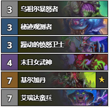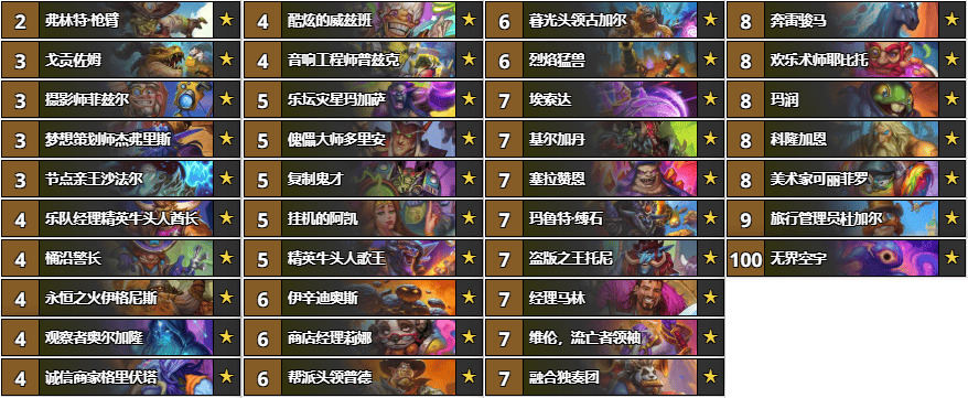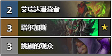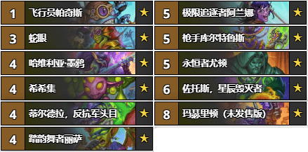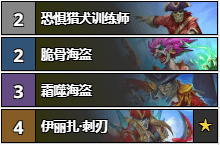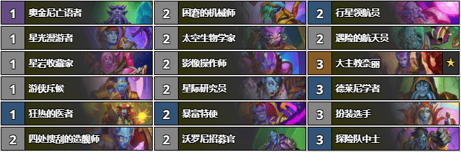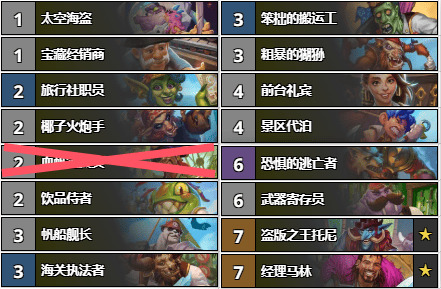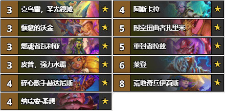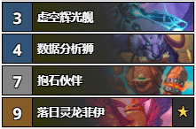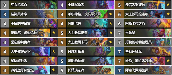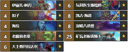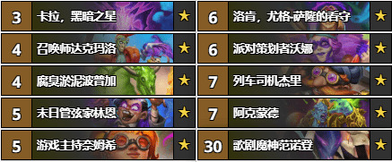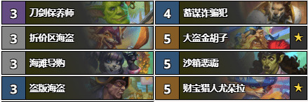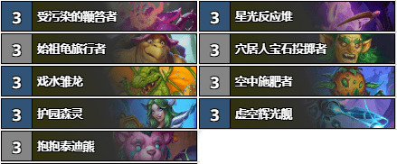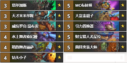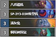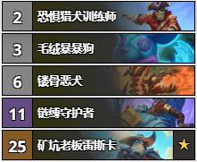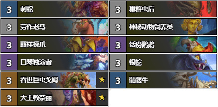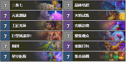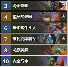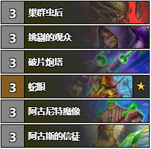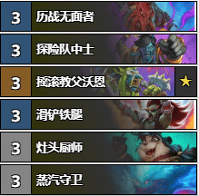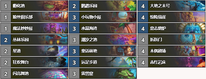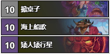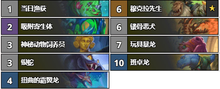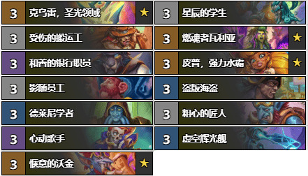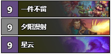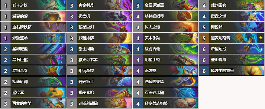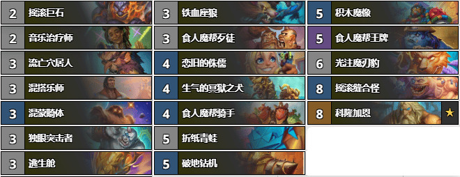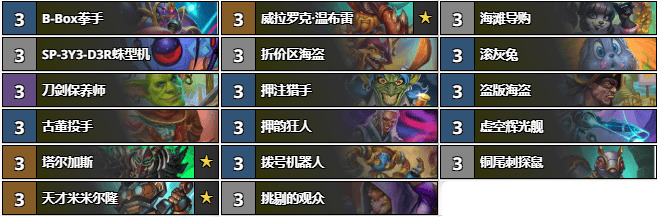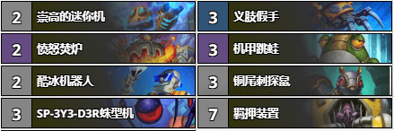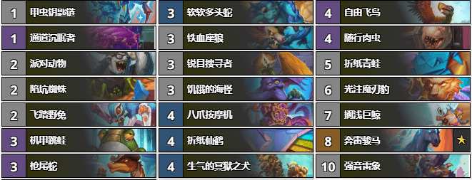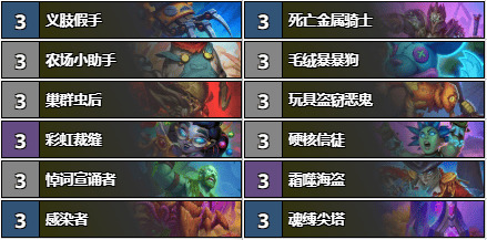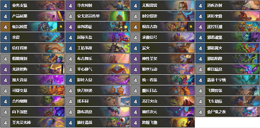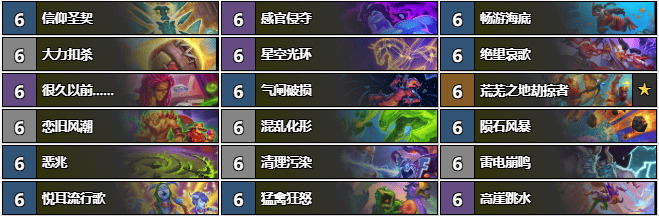 死骑——屈辱头盔、无头骑士、无限滞留、难以喘息、残骸遍野、矿坑老板雷斯卡;瞎子——红牌、挑剔的观众;德鲁伊——星域相变射线;猎人——死亡翻滚、银蛇;法师——买一冻一(仍在禁卡位)、回荡混响、全息技师;骑士——玩具队长塔林姆、不许乱动、审判恶徒、风领主的管号;牧师——感官侵夺、哈哈镜、影叶入侵、暗言术:窃、暗弦术:改;盗贼——挑剔的观众、单曲流星、暗言术:窃、古董投手、持枪要挟(找不许乱动或者银蛇)、可疑交易、横夺硬抢、黑暗圣堂武士;萨满——锁定、攻城坦克、统一着装(伪处理)、风领主的管号;术士——最后期限、混乱吞噬、回荡混响;战士——大和炮、起爆炸药、火焰试炼