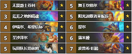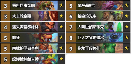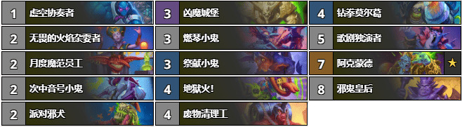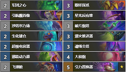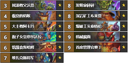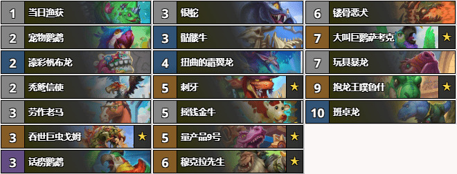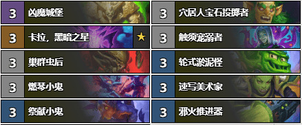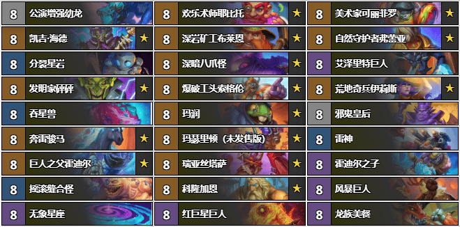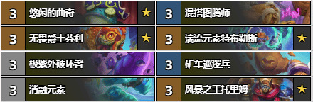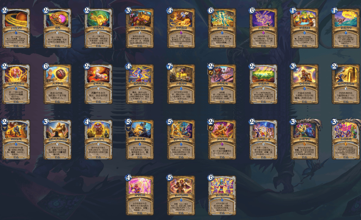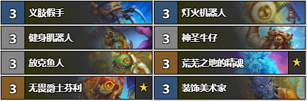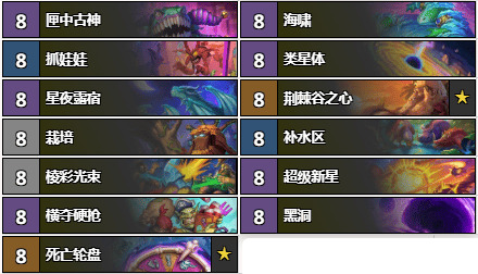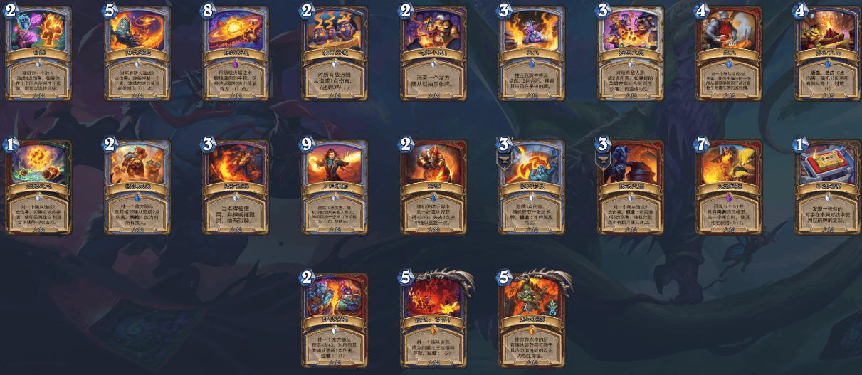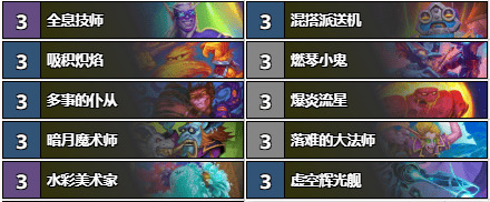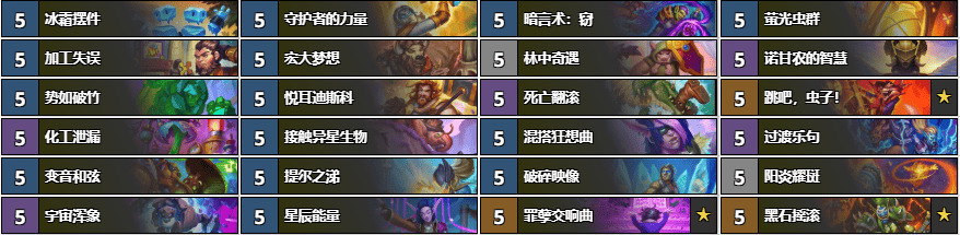 死骑——绝望线缕、爆虫冲锋的爆虫;瞎子——玛瑟里顿(未发售版)、潜入、混搭狂想曲、低沉摇摆、神秘恐魔、邪能陷隙;猎人——抱龙王噗鲁什、迷失者塞尔杜林、星辰能量;法师——巨像、阳炎耀斑、浪潮涌起、星辰能量、求知造物、夕阳漫射、矿工炎术师、热浪来袭;圣骑士——审判恶徒、棱彩光束、守护者的力量(禁卡);牧师——炽热火炭、飞速离架、重新打包、平心静气、悦耳流行歌;盗贼——高阶圣堂武士、持枪要挟(找热浪来袭或者误炸);萨满——飞弹舱、陨石风暴、麦芽岩浆、苏打火山、余震、灾变飓风斯卡尔、巨型风滚草!、雷电崩鸣、即兴演奏;术士——雷兽窟、黑洞、合约细则、多米诺效应、掀桌子、穴居人宝石投掷者、飞翼焊装、渐强声浪、歌剧独演者、罪孽交响曲的愤怒乐章;战士——科多兽皮组鼓、火焰试炼、清理污染、鼓动火焰、余震、爆破龟、荒芜之地乱斗打手、凶恶的入侵者