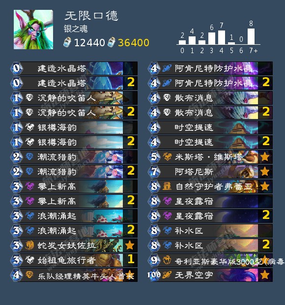 ### 无限口德# 职业:德鲁伊# 模式:标准模式# 天马年## 2x (0) 建造水晶塔# 2x (1) 沉静的吹笛人# 2x (1) 银樽海韵# 2x (2) 潮流猎豹# 1x (3) 始祖龟旅行者# 2x (3) 攀上新高# 2x (3) 浪潮涌起# 1x (3) 蛇发女妖佐拉# 1x (4) 乐队经理精英牛头人酋长# 1x (3) 摄影师菲兹尔# 1x (5) 精神控制技师# 1x (7) 基尔加丹# 2x (4) 散布消息# 2x (4) 时空提速# 2x (4) 阿肯尼特防护水晶# 1x (5) 米斯塔·维斯塔# 1x (7) 阿塔尼斯# 2x (8) 星夜露宿# 1x (8) 自然守护者弗蕾亚# 2x (8) 补水区# 1x (0) 奇利亚斯豪华版3000型# 1x (0) 奇利亚斯豪华版3000型# 1x (4) 病毒模块# 1x (5) 完美模块# 1x (100) 无界空宇# AAECAaa4AwiW1AT9xAXd+gXHpAakuwaluwaq6gaT9AYL/N8FkeAFqeAF1boGgb8G0MoG88oGsc4Gi9wGi/QGlfQGAAEGrNEF/cQF9LMGx6QG97MGx6QG6N4Gx6QG8eYG/cQF6e0G/cQFAAA=# # 想要使用这副套牌,请先复制到剪贴板,然后在游戏中点击“新套牌”进行粘贴。