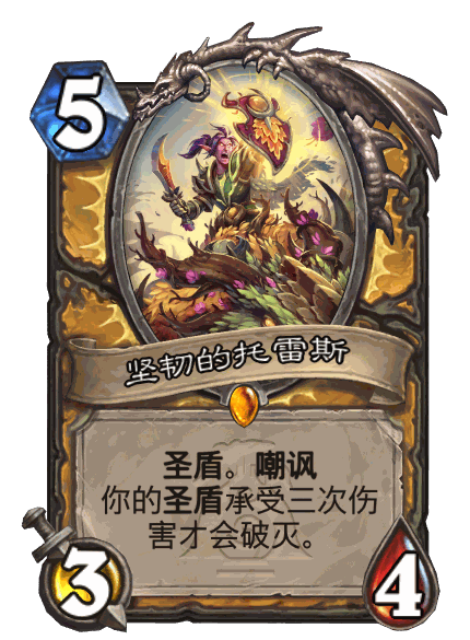 蓝贴资料补充:托雷斯的三破圣盾机制在圣盾被完全打破前不可以通过法术或者随从重新获取圣盾效果;即托雷斯或者其他随从的圣盾被攻击小于三次后不可以用类似神圣佳酿的卡使其重新获得"满血"的圣盾。