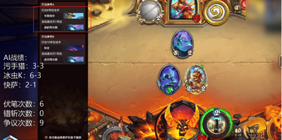 测试过程全程按照AI推荐的参考打法(AI推荐的参考打法会显示在记牌器功能当中),几乎没有进行人为干预。选择的卡组来自于素质标准日报的卡组代码,这代表着AI并不会被既定的卡组限制死,他会按照你对于卡组理解微调的卡组构筑进行不一样的AI推荐打法。