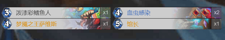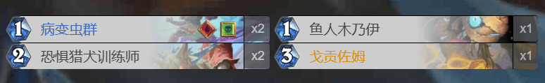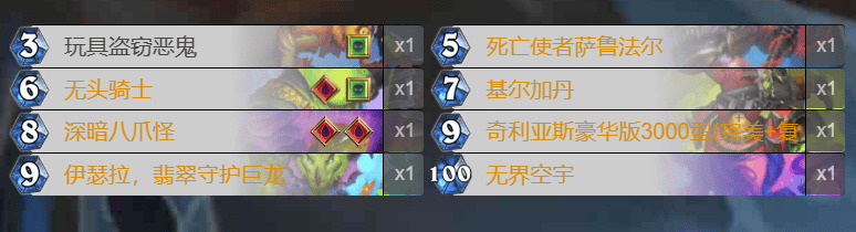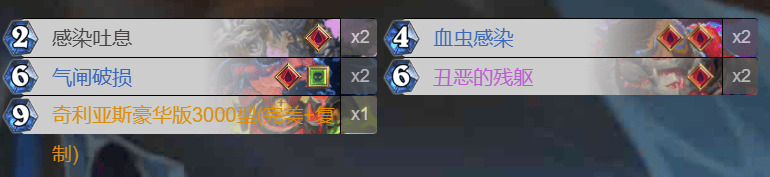 新版本血DK依旧没有合适的终端,所以卡组的思路和以往标准血DK一样——打资源守赢。受退环境的影响DK的优质后期卡少了很多,如兵主,855等,但介于新版本大家都是谭涛,DK还是有打厚度的资本的。卡组的总思路是依靠八爪鱼快速与对手拖入后期,由于新版本有绿龙的额外费用,在打出鸡蛋和无头拿到头后我们每回合有两张可以出的牌,另外由于超高的血量,每回合还能多出一张加强后的死亡使者,将对手拖死。因为我们是两红,新版本又有水蛭这一不错的苟活体系,加上新版本DK强大的过牌能力(血虫感染,馆长),所以拖死对手的思路我觉得是可行的。