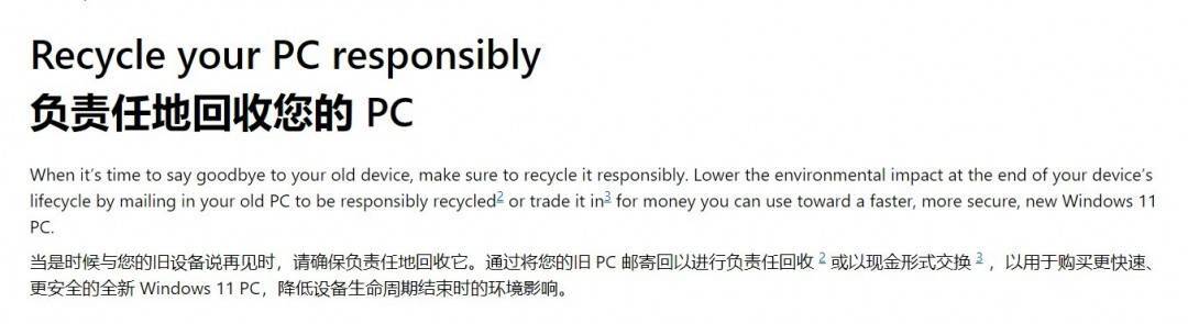 微软建议用户通过专业渠道回收旧电脑,或是通过以旧换新获得购机补贴,升级到更快、更安全的全新Windows 11电脑,同时降低设备报废时对环境的影响。