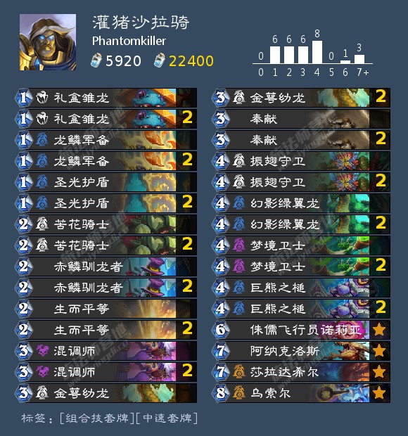 思路基于https://mob.iyingdi.com/post/5588800。玩了很多把这个卡组,一直遇到dk、dh、术士,场铺不了一直输。后来换成了偏向抽牌的体系也还是差不多结果。感觉还是得一直给场面压力和骗解牌才能通过3波光环制胜。一张张看骑士的卡想通过组一套高质量卡的卡组来贯彻骑士传统的按费拍怪压死对手的思路,发现没什么高质卡,质量卡全在灌猪那了,最后组了灌猪体系卡组。