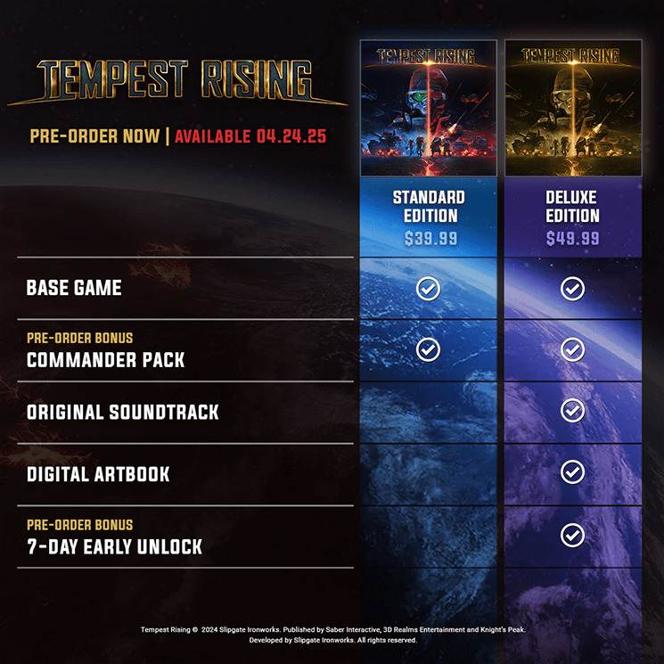 豪华版玩家还将获得一本展示《风暴崛起》艺术风格和背景故事的数字艺术画册,以及完整的数字游戏原声音乐。原声音乐包含传奇的《命令与征服》作曲家Frank Klepacki创作的41首曲目,还有Michael Markie、Hexenkraft、Music Imaginary:Cielecki/Skorupa/Wierzynkiewic以及Sigurd Jøhnk-Jensen等深受玩家喜爱的创作者的作品。