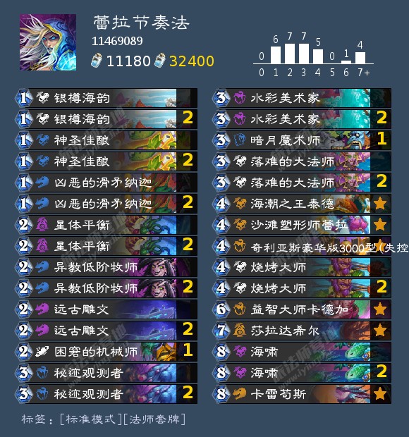 加入322奥秘恶魔和232小塞布,搭配法师大小法术体系,形成丝滑的节奏卡组。从钻四17场15胜,上传说。不过这里运气成分不少,但是去掉去掉运气成分,依然是很强的卡组。