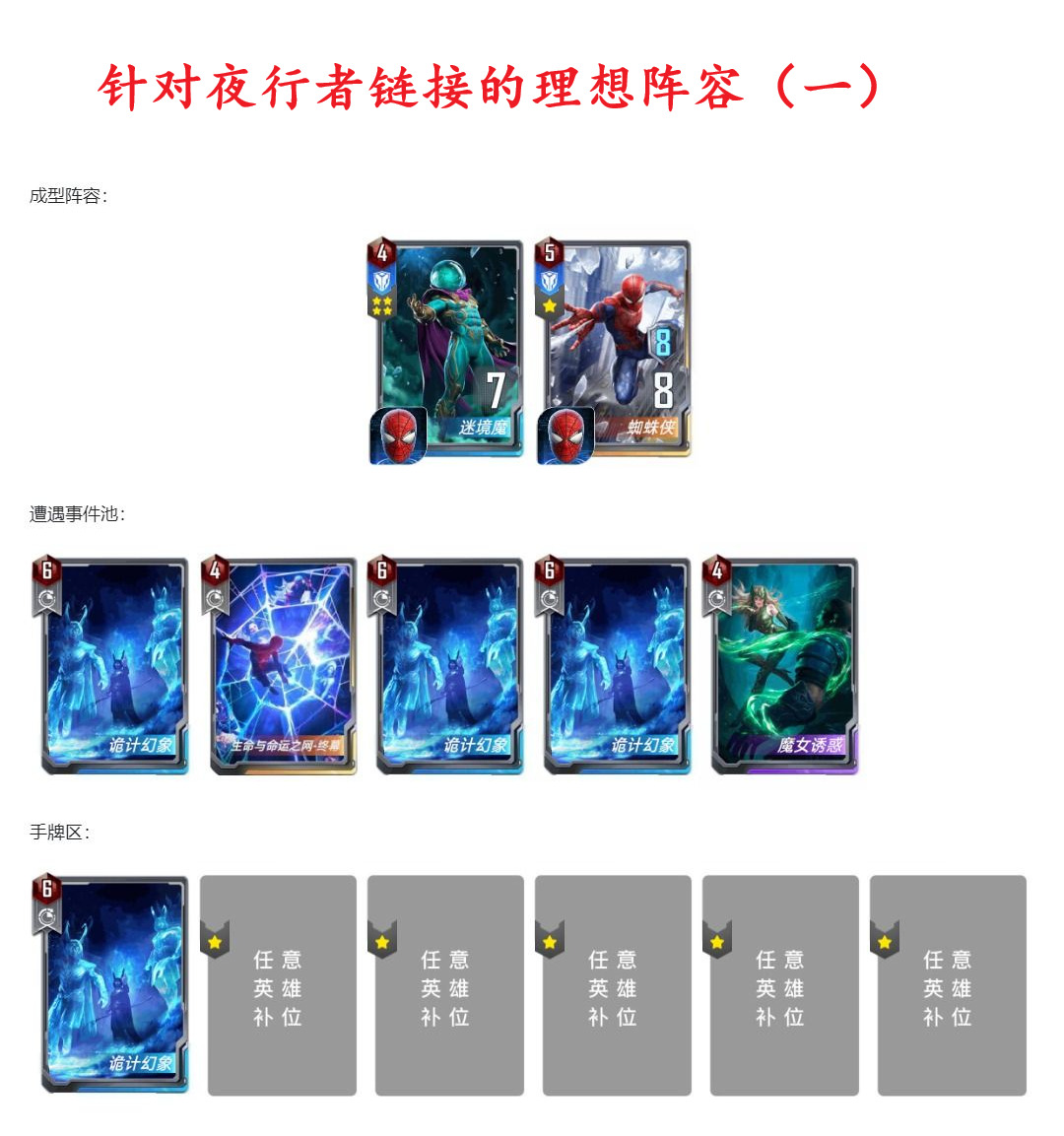 由于场上只有1-2个蜘蛛角色,开场直接触发命网终幕,其他蜘蛛入场攻击自杀后,触发迷境魔的面具亡语,只要变到夜行者,就赢了。