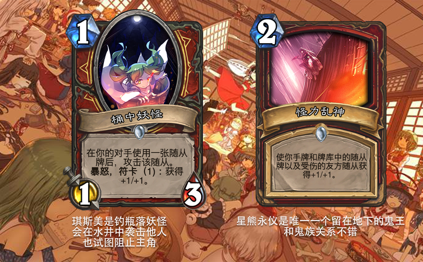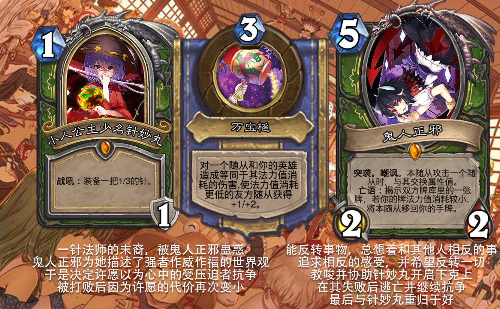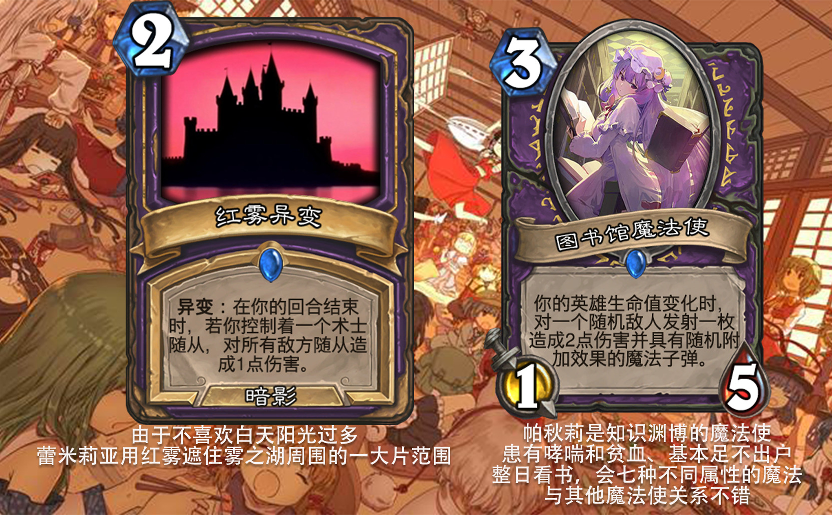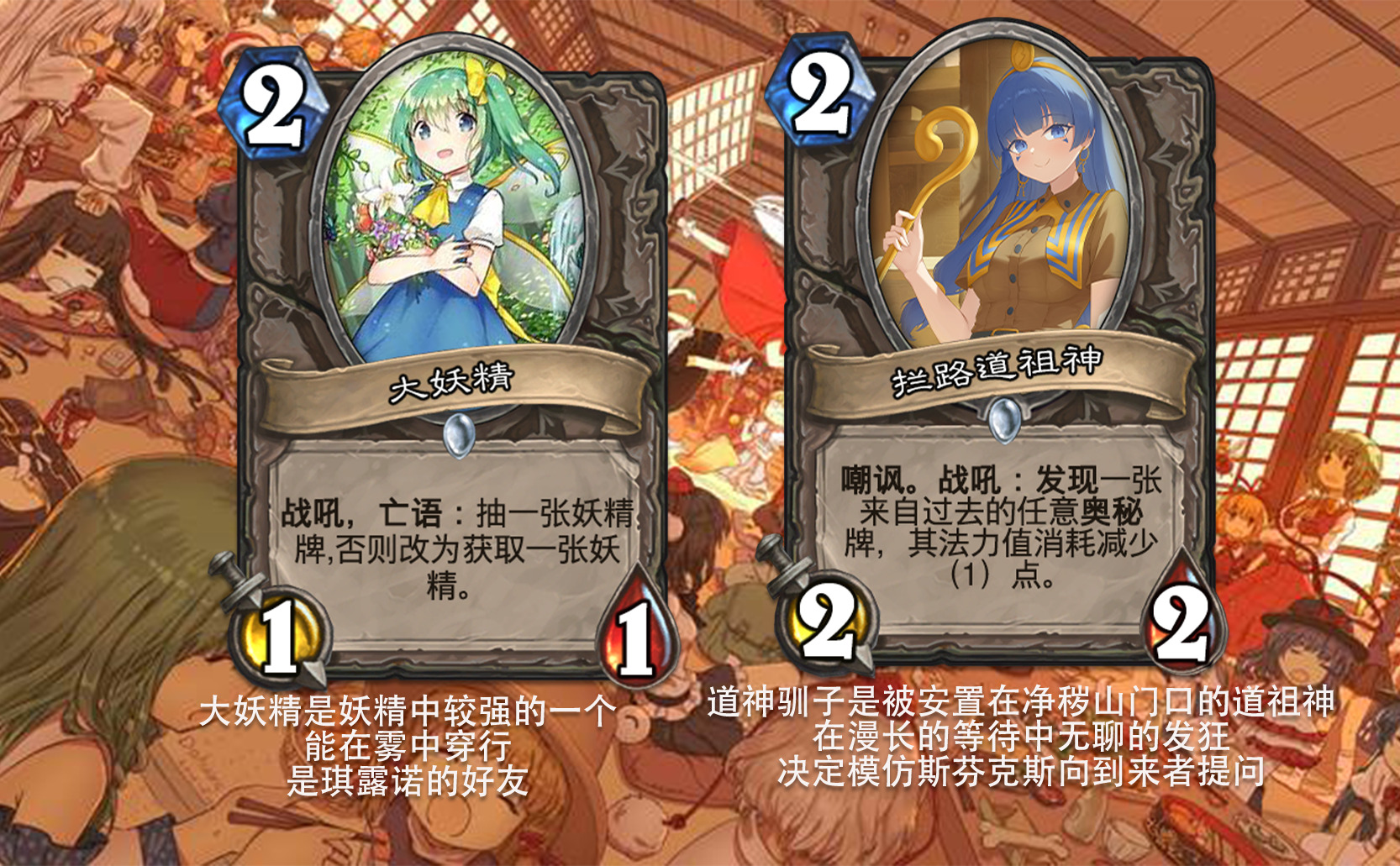 目前好像没看到以东方为主题的完整拓展包,因此打算尝试一下,不得不说做扩展包的困难度和做单卡完全不是一回事,即便多次考虑效果是否合适,估计依然会有难以预料的致命错误,不过毕竟diy是为了自我满足,尽力就好,无所谓了。 只能说但凡炉石再淘汰一批关键词,或者东方再出一组新角色,这个扩展包都没法塞下,能赶在这之前做出来,谢天谢地。