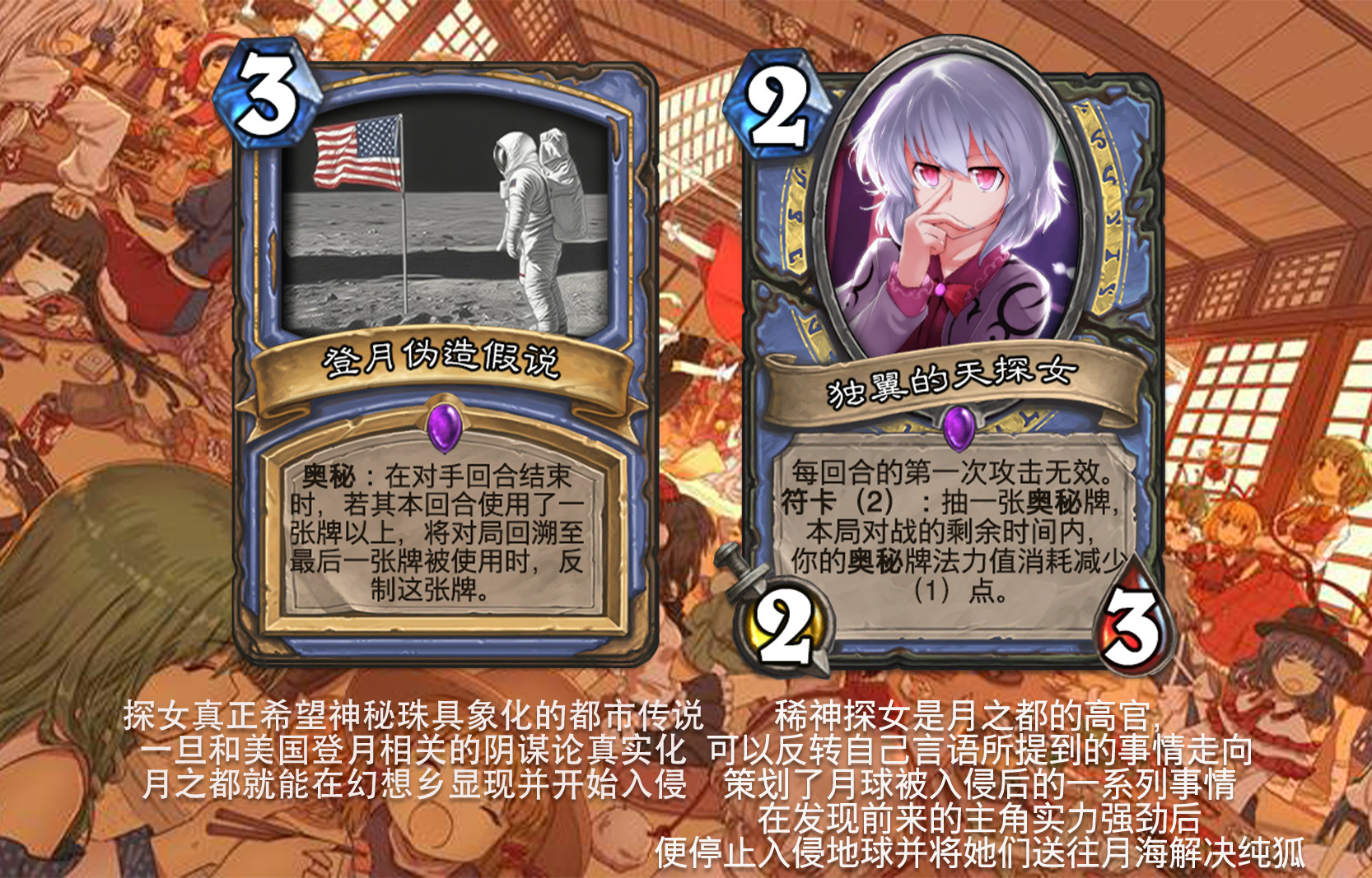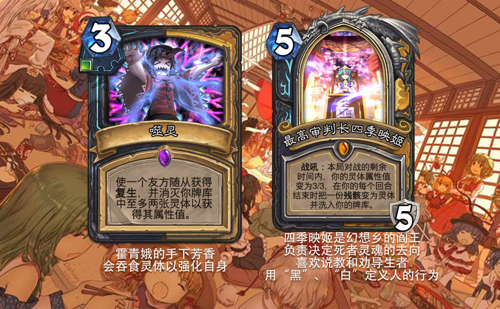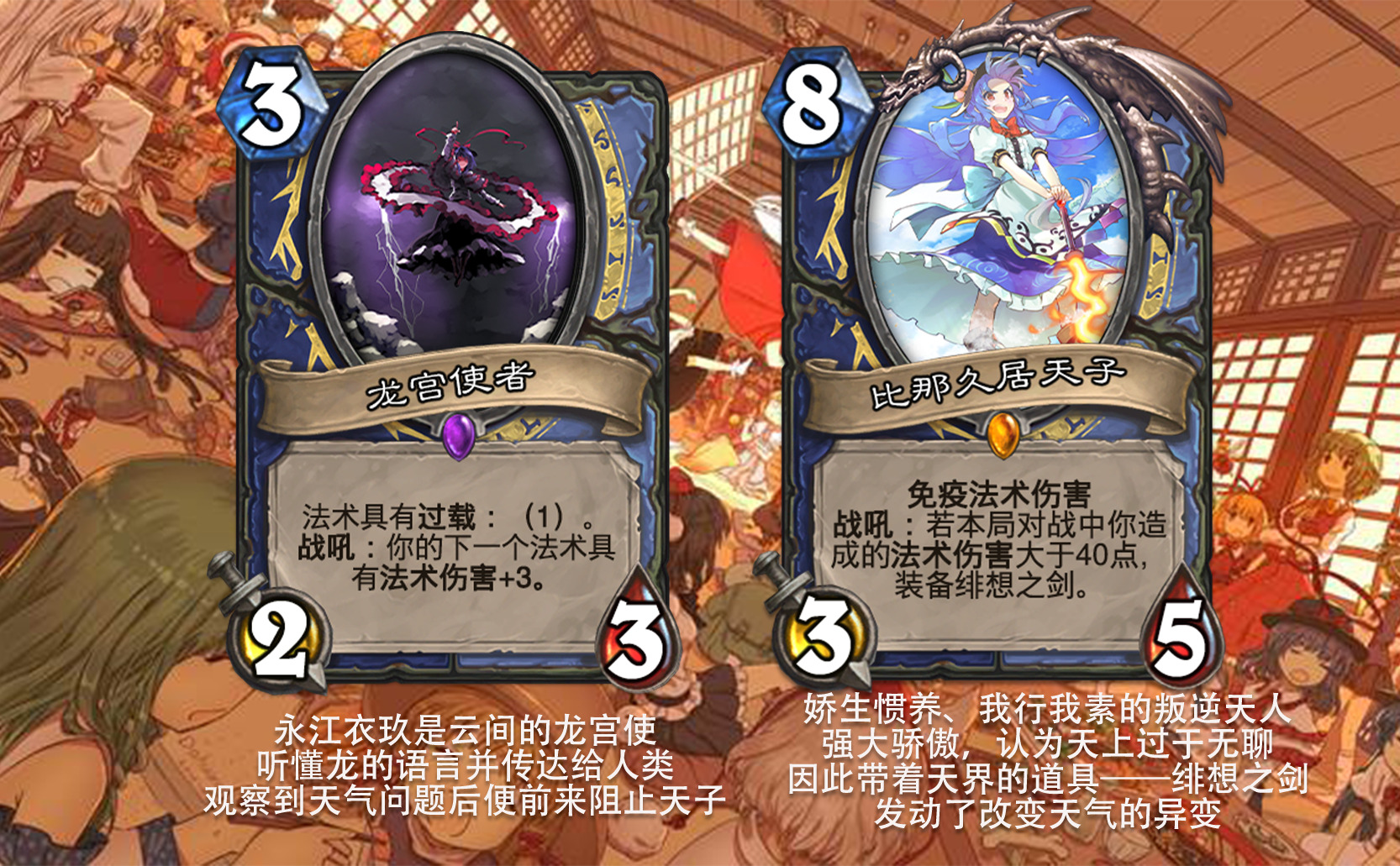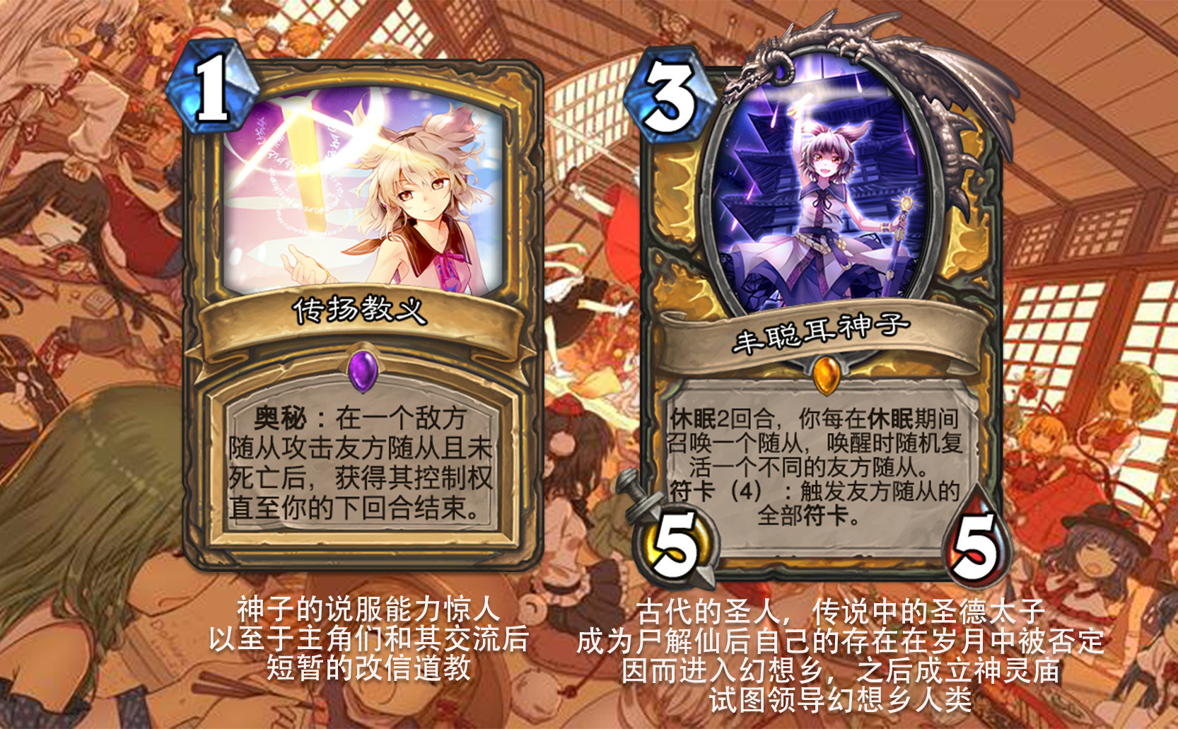 目前好像没看到以东方为主题的完整拓展包,因此打算尝试一下,不得不说做扩展包的困难度和做单卡完全不是一回事,即便多次考虑效果是否合适,估计依然会有难以预料的致命错误,不过毕竟diy是为了自我满足,尽力就好,无所谓了。 只能说但凡炉石再淘汰一批关键词,或者东方再出一组新角色,这个扩展包都没法塞下,能赶在这之前做出来,谢天谢地。