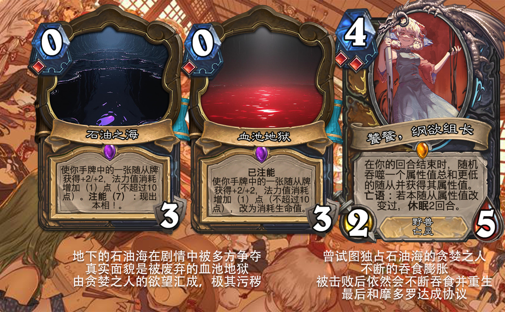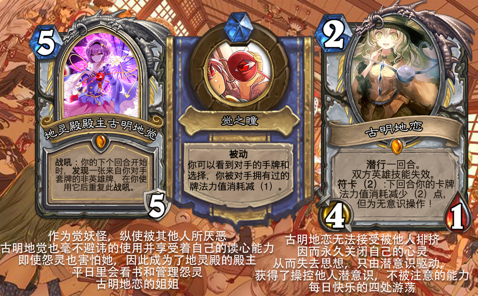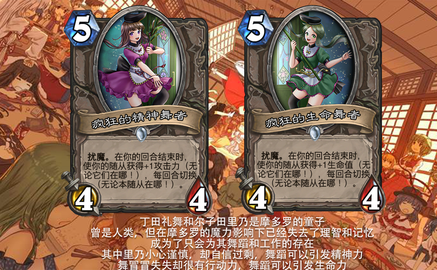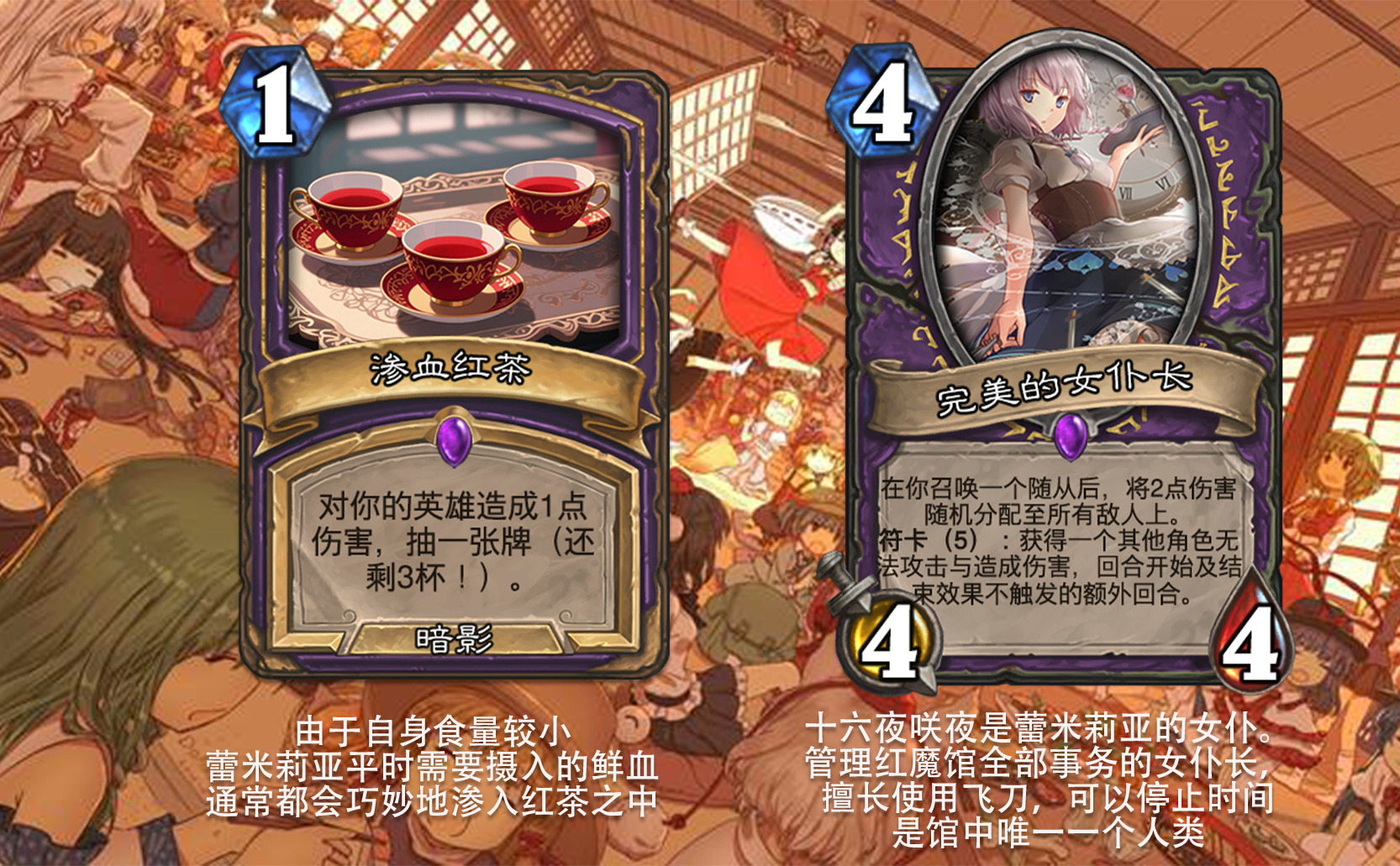 目前好像没看到以东方为主题的完整拓展包,因此打算尝试一下,不得不说做扩展包的困难度和做单卡完全不是一回事,即便多次考虑效果是否合适,估计依然会有难以预料的致命错误,不过毕竟diy是为了自我满足,尽力就好,无所谓了。 只能说但凡炉石再淘汰一批关键词,或者东方再出一组新角色,这个扩展包都没法塞下,能赶在这之前做出来,谢天谢地。
