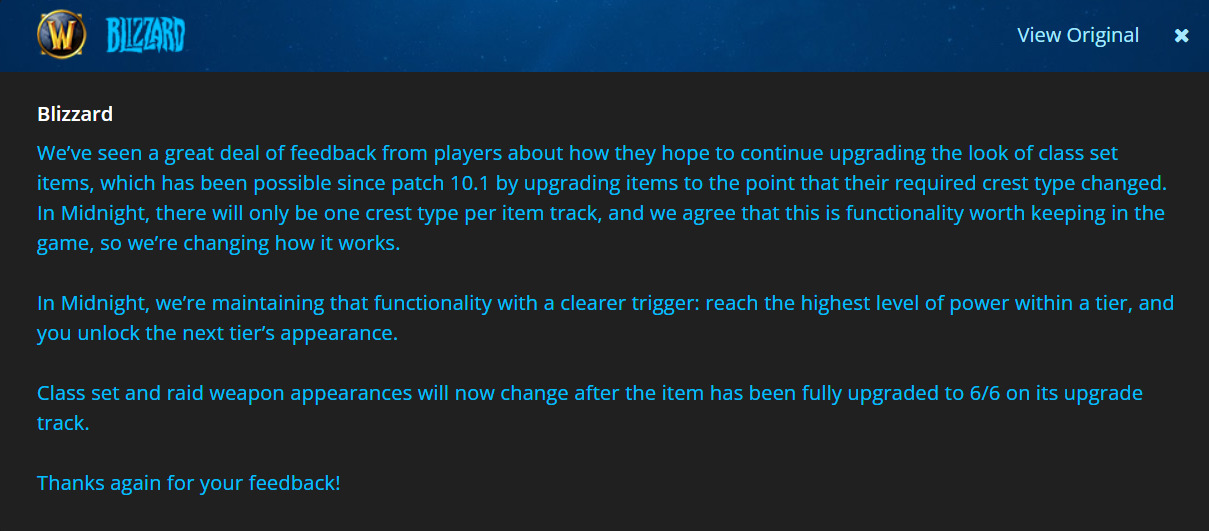 职业套装与团队副本武器的外观,将在物品于其升级轨道上被完全升至 6/6 后发生变化。
