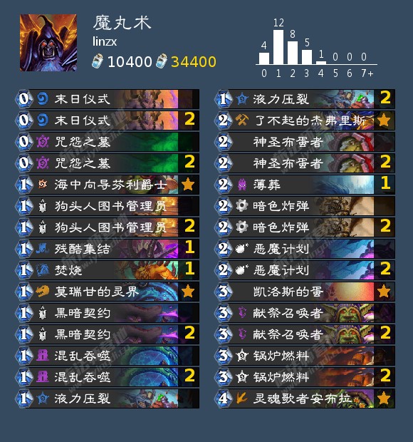 起手必留蛋液力压裂咒怨之墓,手牌没蛋可留112抽蛋,手牌有蛋(或抽蛋)可留献祭召唤者或安布拉。卡组带了两张恶魔计划用来针对巴风德这种更快的otk,如果环境里沉默多的话可以带张亡者复生或尸身保护令,场上裸蛋的情况下,对面姐夫是会稳定给0费沉默的。