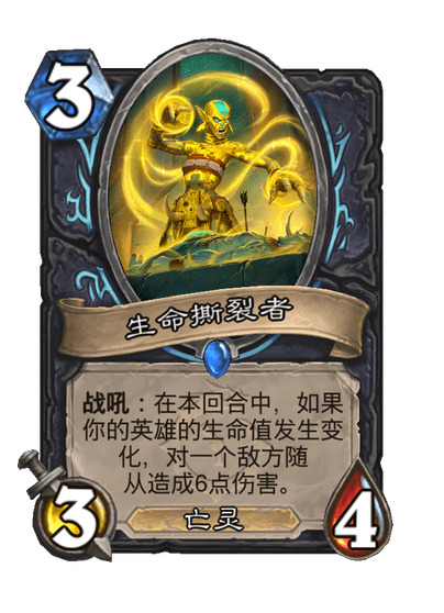 :在本回合中,如果你的英雄的生命值发生变化,对一个敌方随从造成6点伤害。