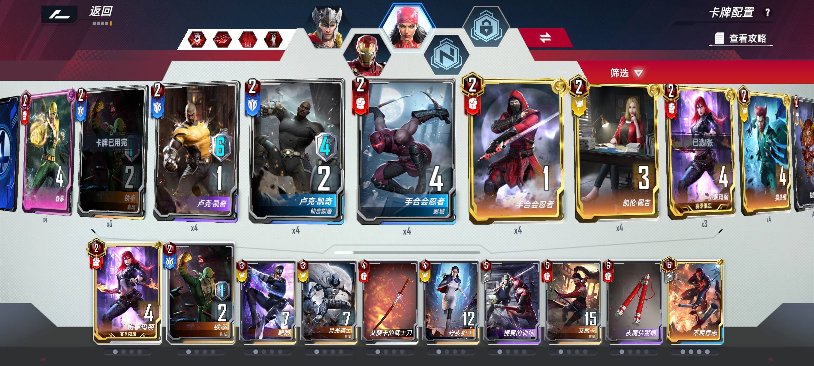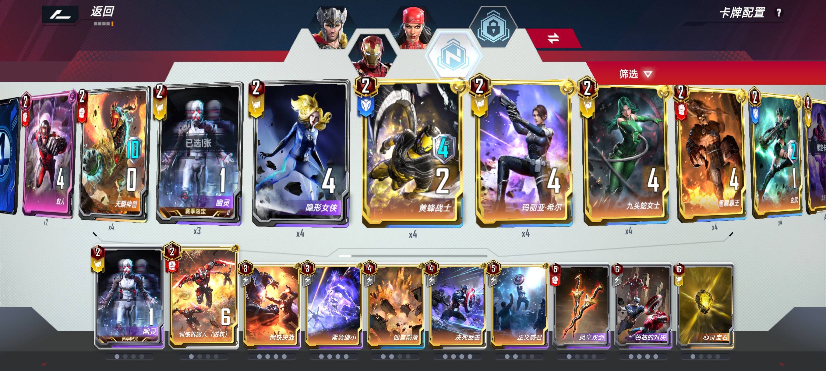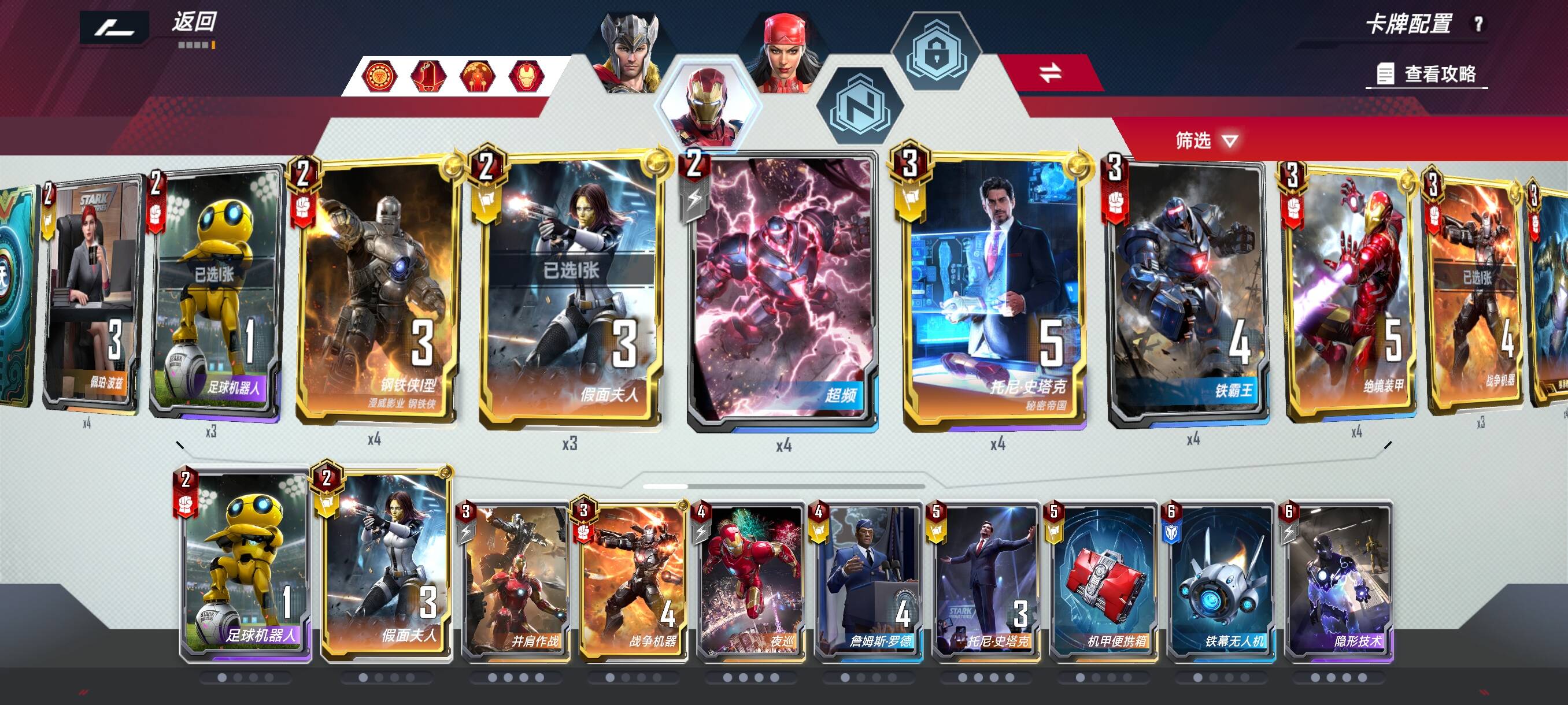 钢铁侠的配卡我选择的是速本带法,后续节奏会讲。这是我比较舒服的速本带法,比起小辣椒我更喜欢假面夫人,带小辣椒也是可以的。而3费带标战争机器也是因为他是援军,不会亏经济。4费带夜巡和罗德,罗德没有关键字,不会影响感召,并且改良后会获得援军,经济方面也会比钢铁爱国者丝滑。5、6费托尼和隐形技术拉满,另一个5费和6费卡位因为不会买,所以不影响。