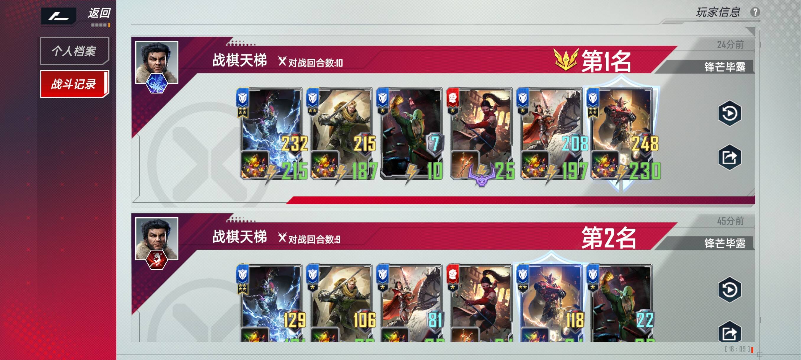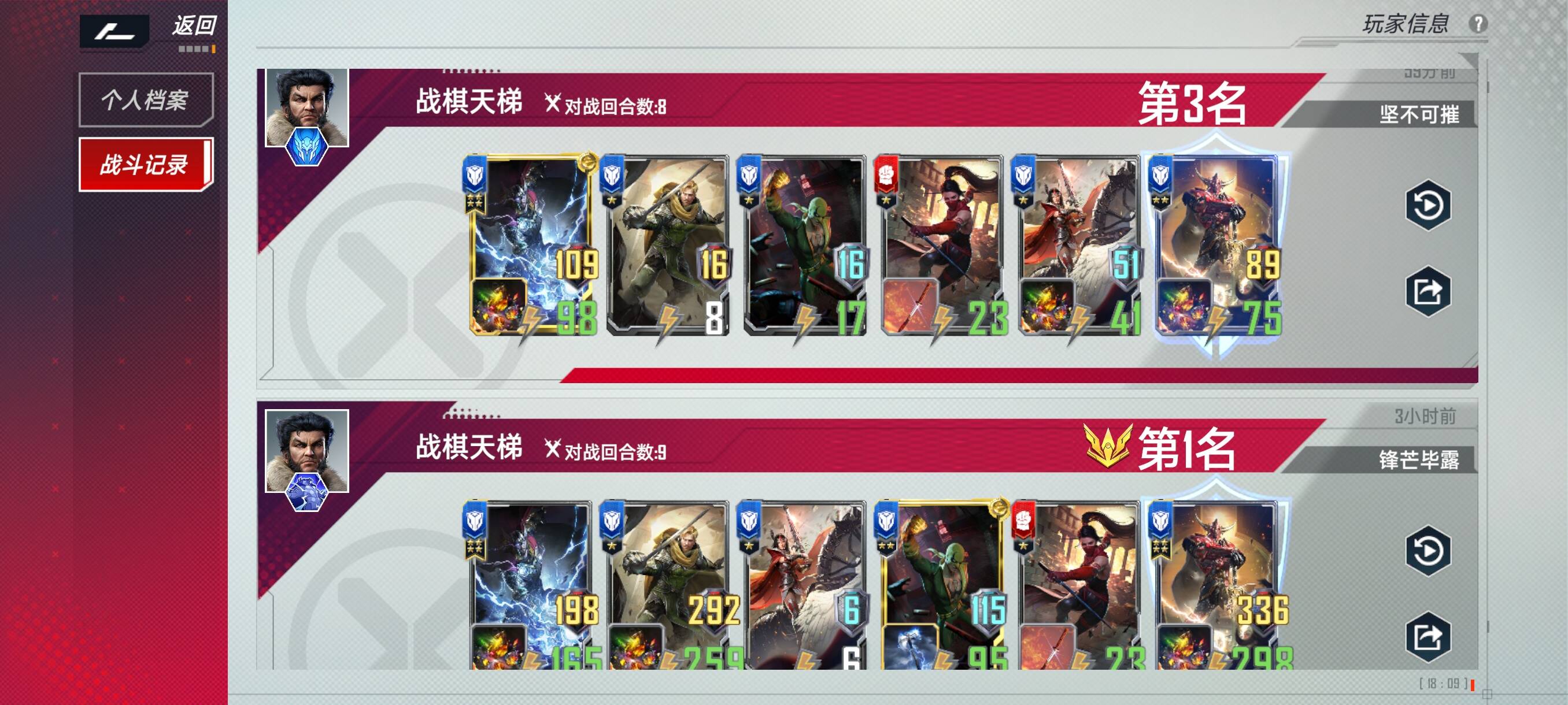 2费我选择伤寒玛丽和影域铁拳,伤寒玛丽这赛季新增的首发还算好用,并且打出下回合拿到的+2战力的漫威骑士角色在前2回合也能稳血。而带影域铁拳,1是因为他厉害,在前期数值就不差,2是因为他能配合新出的影域艾丽卡。3费选择靶眼和影域月光骑士,这两个是经济牌。4费其实带啥都行,我喜欢带护士用来控下血,带别的也可以。5费如果可以的话,带艾丽卡和尚气,我现在还没获得尚气,所以先带其他的,艾丽卡1张够了,主要作用就是让对方角色打自己人,升星提升的那些伤害就不是很必要。6费不屈意志拉满,万一刚好卡7血就又是一波战力膨胀。另一个6费卡位带啥都行。