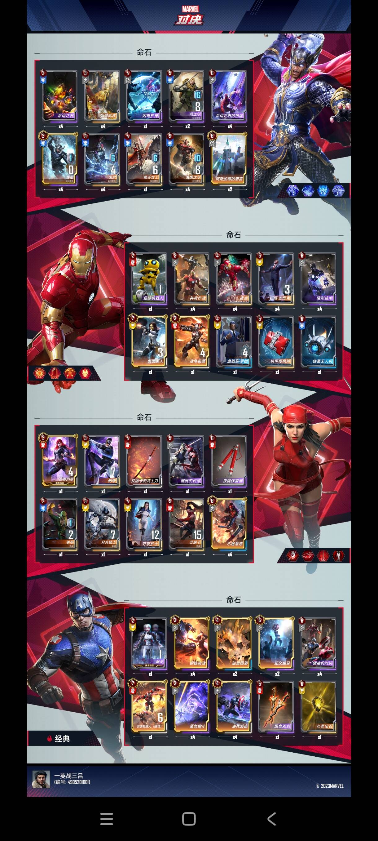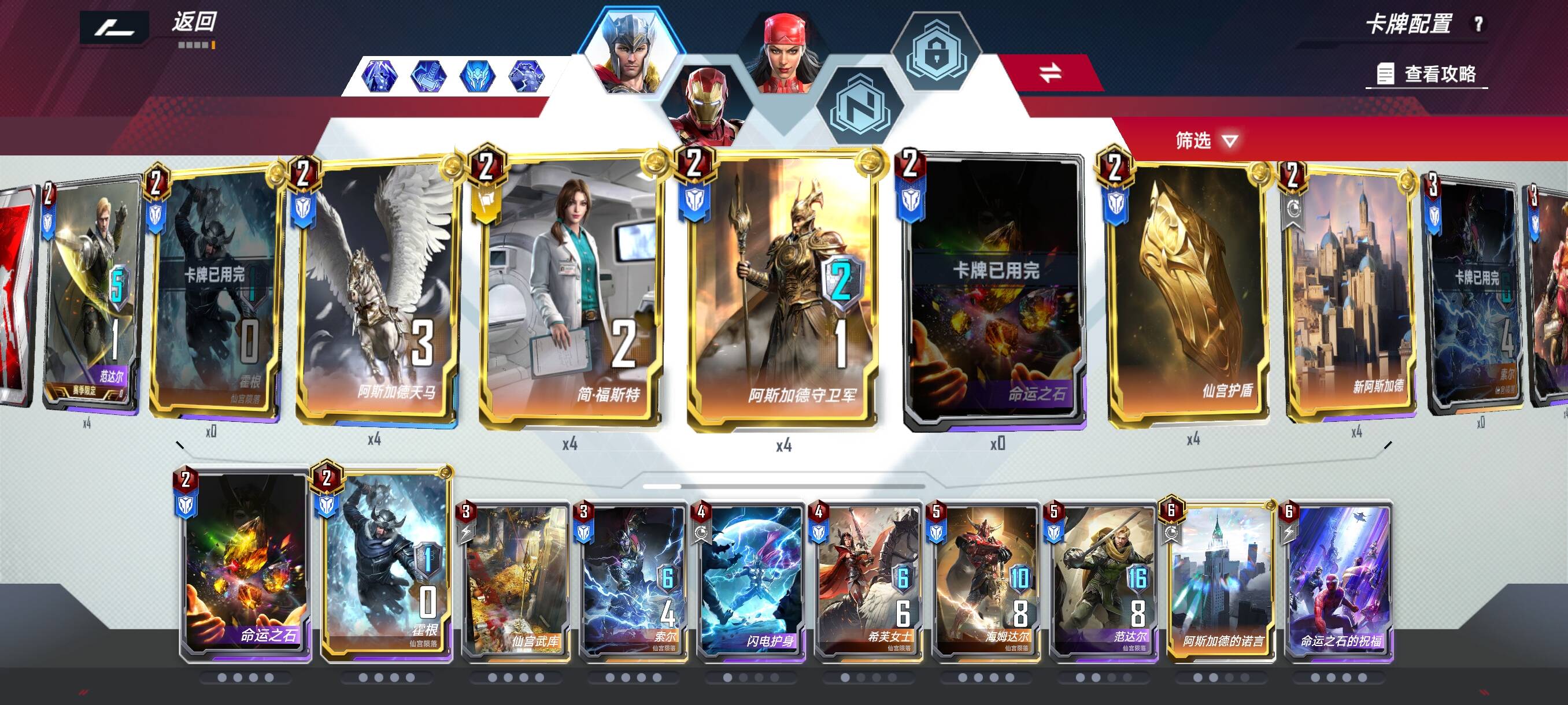 技能方面我选择的是斯塔克制造、机甲维护、天才创造、能量核心。斯塔克创造能提供额外经济,机甲维护能回血,天才创造能在5本时使用去找海姆达尔,能量核心能让我们在速本时提供额外的战力支持。这里着重讲一下能量核心,这套速本卡组,当我们从4本升到5本时是有几率能拿到6费钢铁侠或者异界钢铁侠的,这样短时间内能起到一定的稳血作用。对局中主要还是选择索尔的技能,其次是艾丽卡的技能。