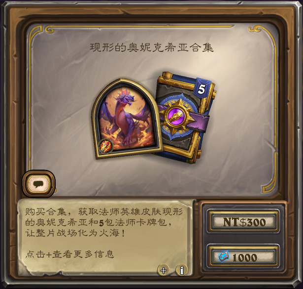 含构筑模式法师新皮肤“现形的奥妮克希亚”和5法师包,售价600奥术宝珠(国服)/1000符文石(外服)。