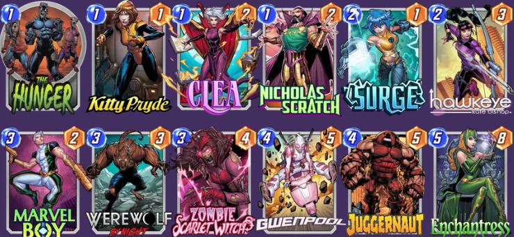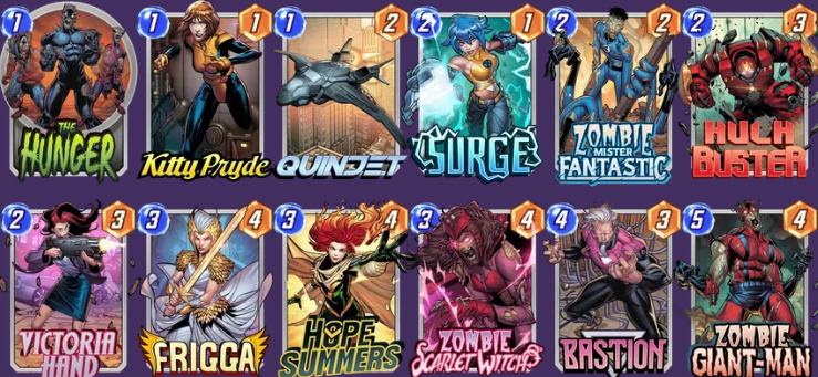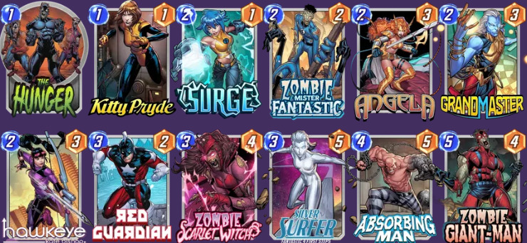 卡组核心:【凯蒂·普莱德】【安吉拉】【丧尸猩红女巫】【丧尸巨人侠】