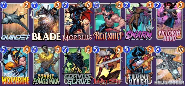 来自设计师Glenn的构筑推荐,他在圣所模式使用这套卡组,经笔者在天梯测试也能达到十分有趣的展开效果(带了【丧尸力量人】也算丧尸卡组,很合理)。之所以说有趣而不说强力,是因为这套牌绝大多数取决于【天空母舰】发给你什么,能给你还是对手带来惊喜谁也说不准。大致思路是利用多张弃牌组件弃置核心战力(其中【蜂群】和【天空母舰】最优),再利用【昆式战斗机】和【维多利亚·汉德】辅助后期展开,起手有【莫比亚斯】+【丧尸力量人】基本能确保每回合能稳定弃牌,因此有条件的朋友可以尝试把【金刚狼】替换成【美国上校】。卡组整体以娱乐性为主,适合用于调剂枯燥的天梯环境,着急上分的朋友请慎用。