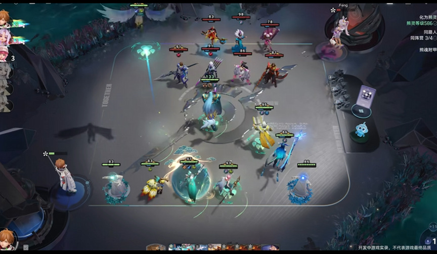 透过PV可以看到,目前很多展示阵容的设计根植于《王者荣耀》中现有的背景故事和人物关系,将“王者关系网”更直观的表达出来,在策略游戏中仍保有一份独特的叙事形态。同时,环绕东皇太一的法球,张良定住敌人的法阵,抑或是瑶在对局开始时变成护盾的形态,都保持了角色间、角色与王者对应英雄的强关联性设计,现在在提取角色特色和保持角色关联上狠下了功夫。