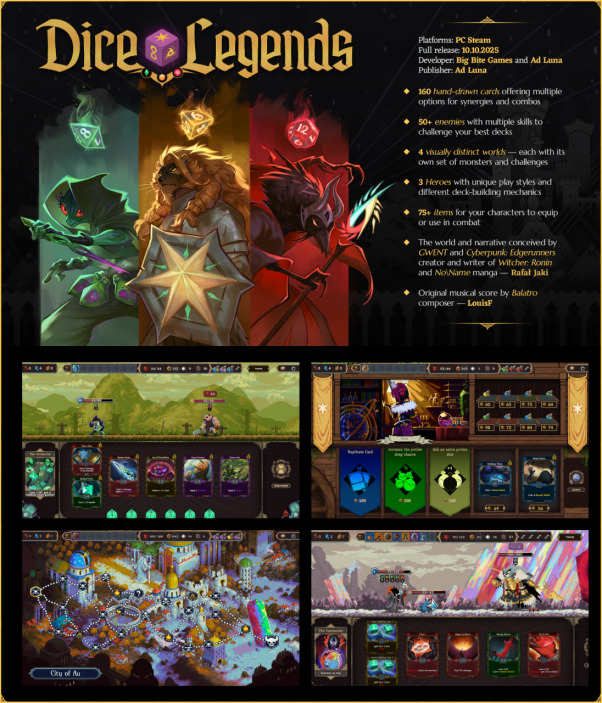 《骰子传奇》由一个充满雄心的小型独立团队打造,团队成员包括《巫师之昆特牌》和《赛博朋克:边缘行者》的创意主脑 Rafał Jaki。这款作品既是对由《杀戮尖塔》所普及的卡组构筑类游戏的深情致敬,也是一场通过全新创意与机制来进一步升华这一类型的尝试。游戏配乐由《Balatro》作曲家 LouisF 创作,带来充满活力与节奏感的原创音乐体验。