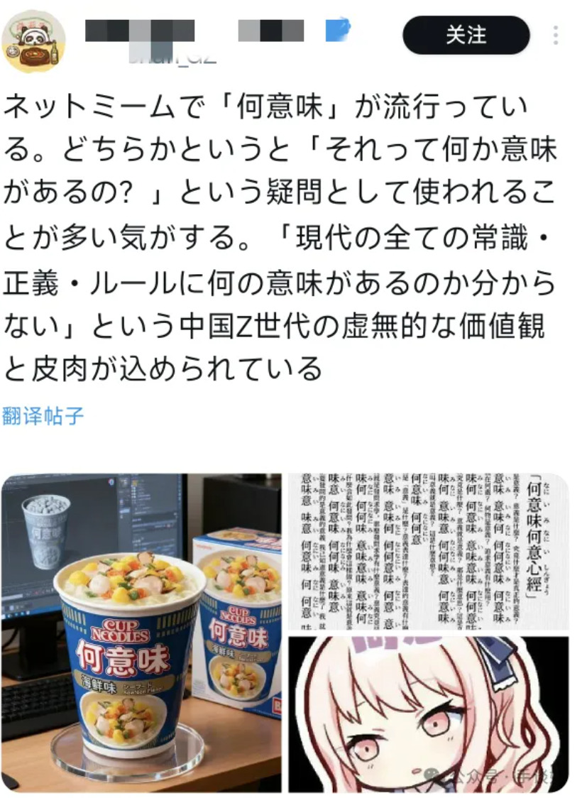 “网络迷因中‘何意味(什么意思)’正流行。感觉大多是作为‘那有什么意义吗’这样的疑问来使用的。其中还暗含着对中国 Z 世代‘不明白现代所有常识、正义、规则有什么意义’这种虚无价值观的讽刺。”