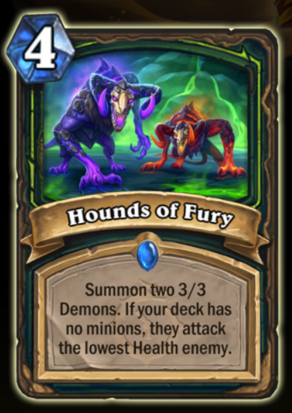 召唤两个3/3的恶魔。如果你的牌库中没有随从牌,使其攻击生命值最低的敌人。