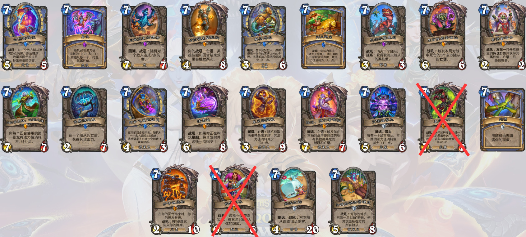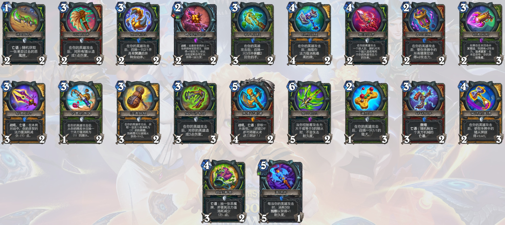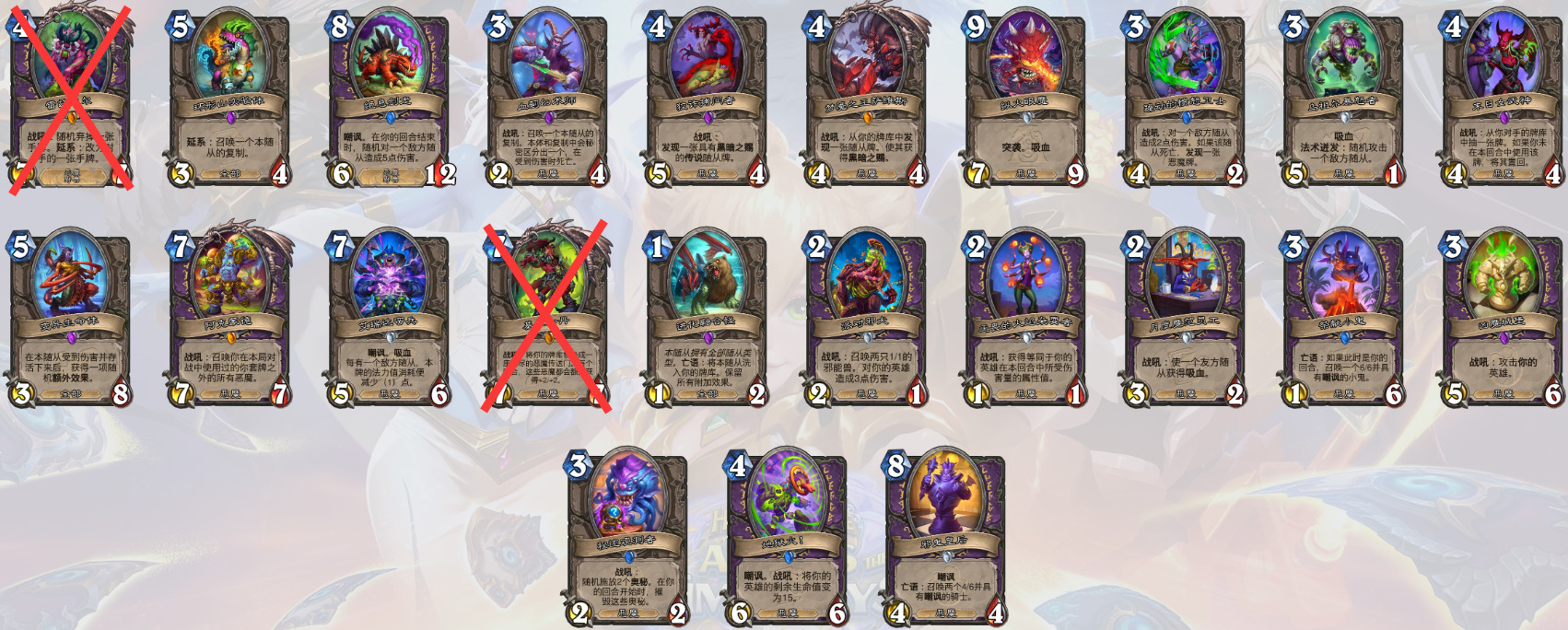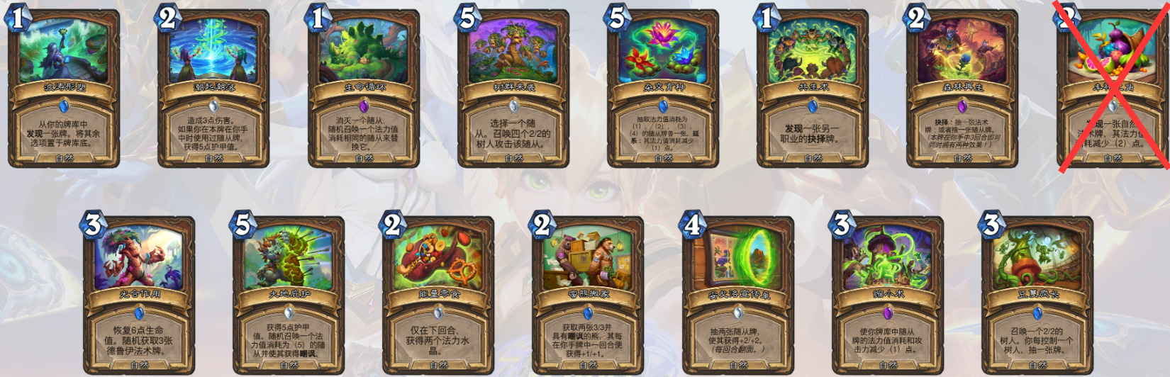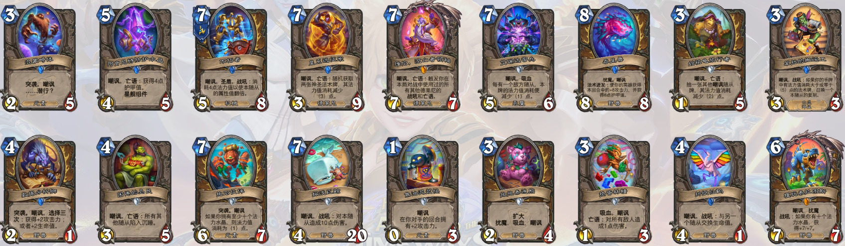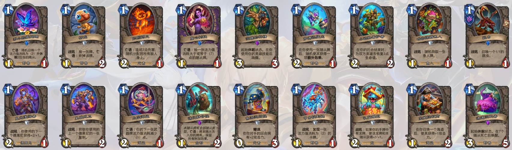 1费:共21张(不包括清道夫自己),比较好的牌有生命火花、禁忌神龛、银樽海韵、甲虫钥匙链,占比19%;