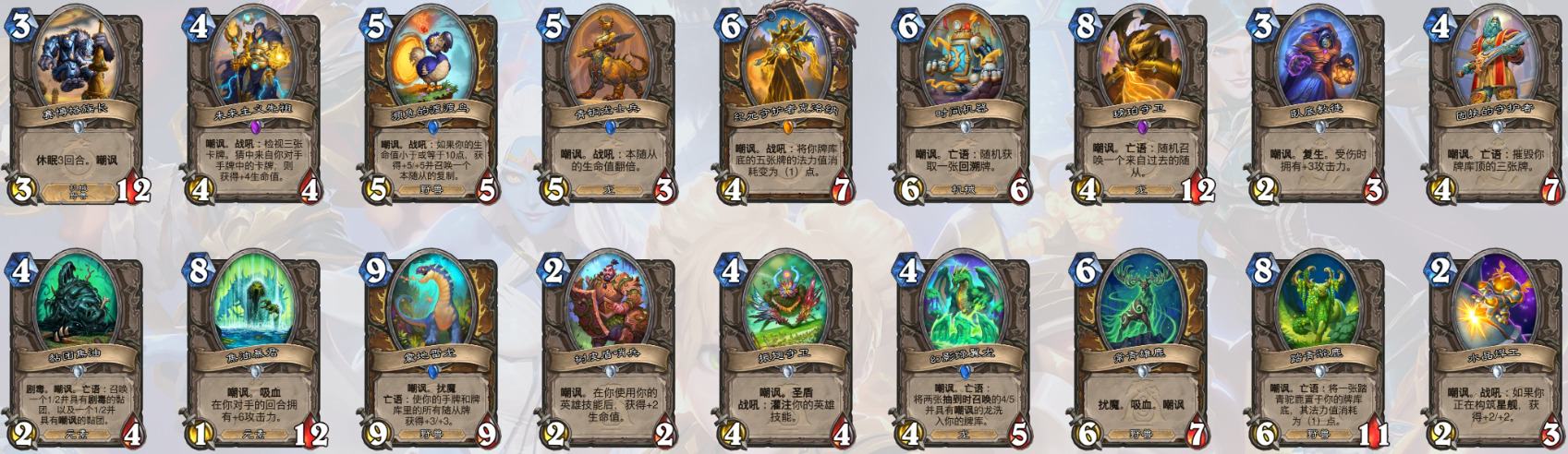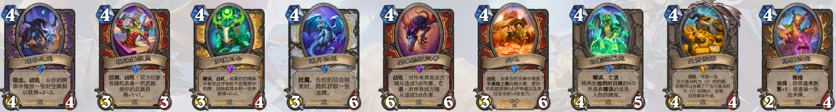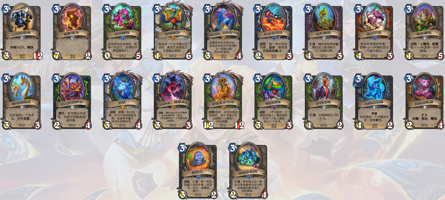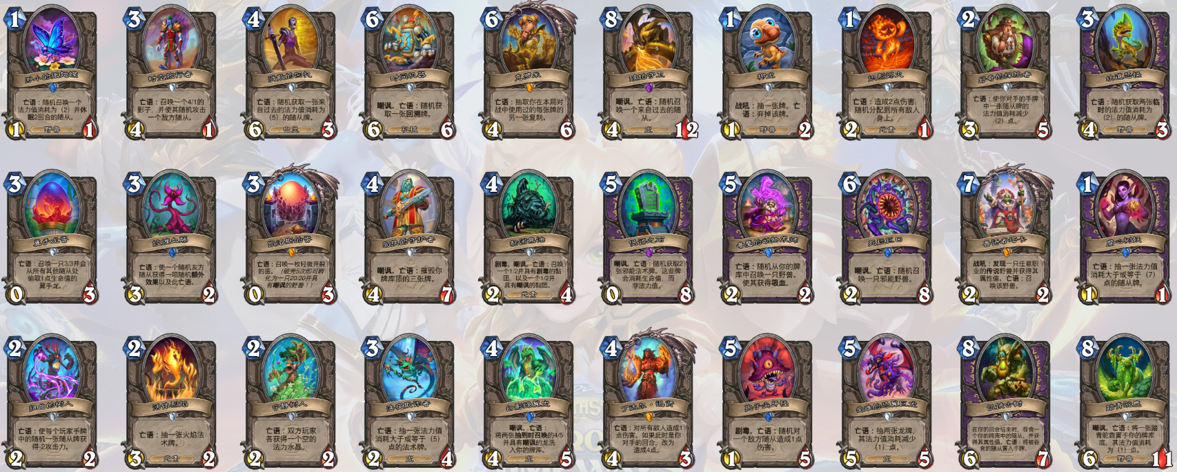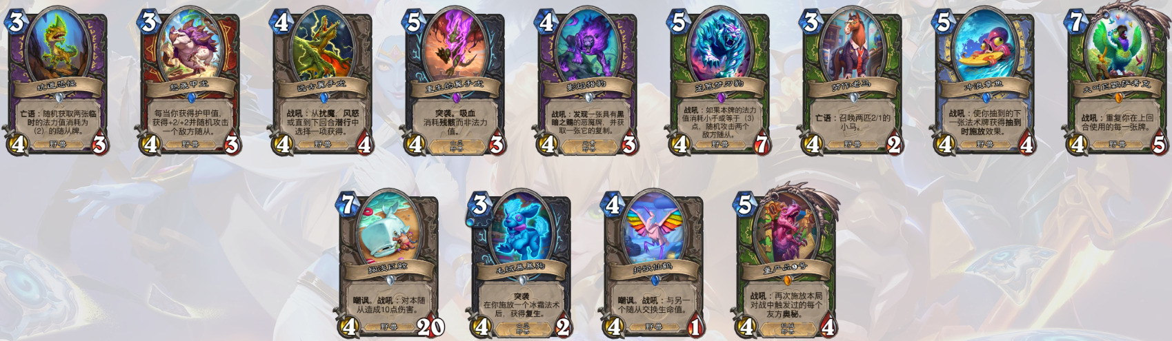 4费:共54张,比较好的牌有时光循环者托奇、黏团焦油、狡诈拷问者、振翅守卫、梦魇之王萨维斯、沙滩塑形师蕾拉、随行肉虫、诚信商家格里伏塔、戈贡佐姆、霜巫十字绣、恋旧的侏儒、折纸仙鹤、套娃傀儡等15张左右,占比约27.8%;
