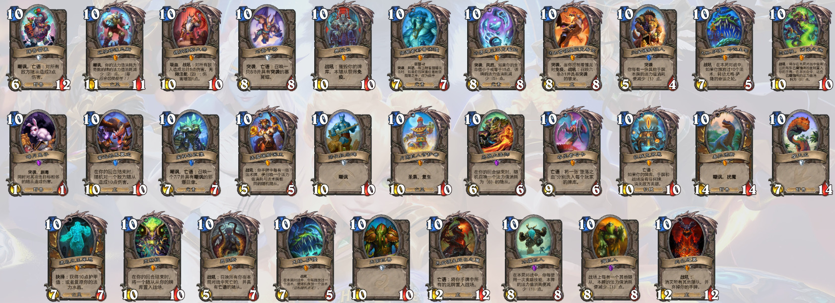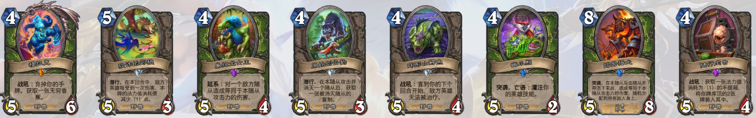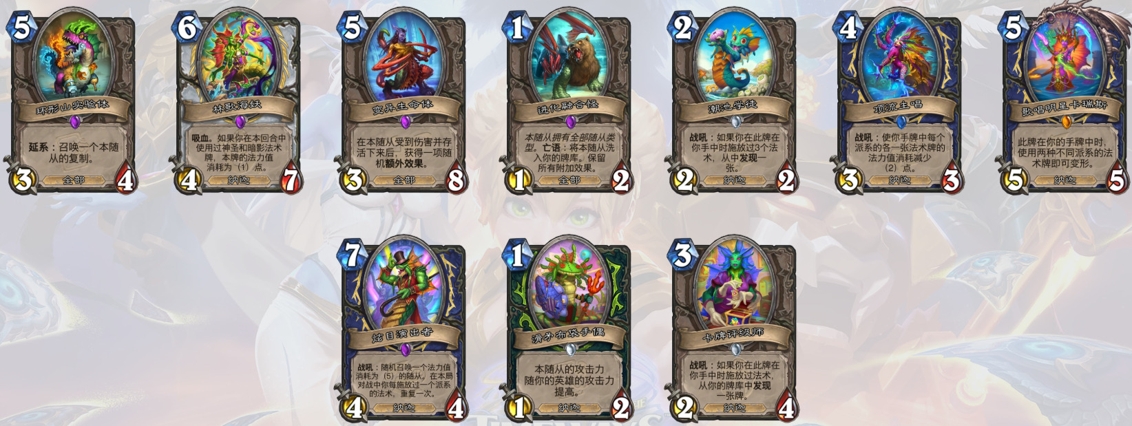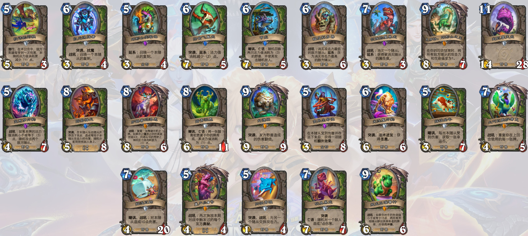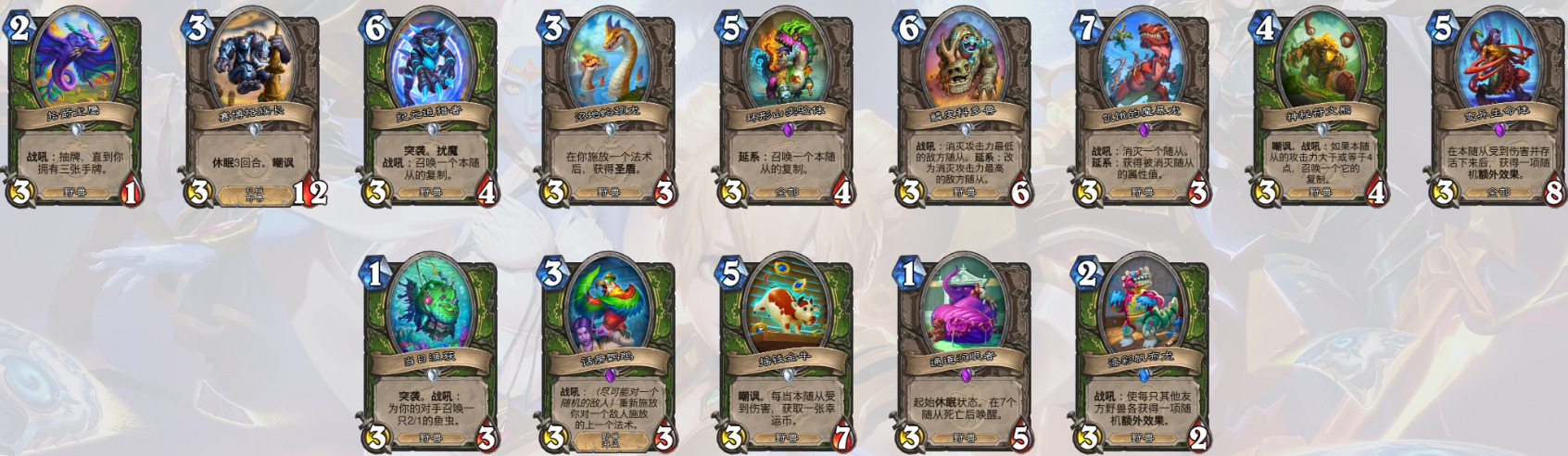 4费:共54张,比较好的牌有时光循环者托奇、黏团焦油、狡诈拷问者、振翅守卫、梦魇之王萨维斯、沙滩塑形师蕾拉、随行肉虫、诚信商家格里伏塔、戈贡佐姆、霜巫十字绣、恋旧的侏儒、折纸仙鹤、套娃傀儡等15张左右,占比约27.8%;