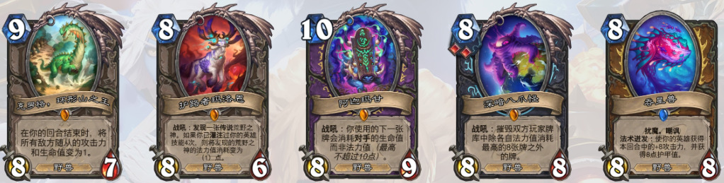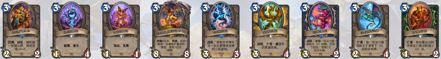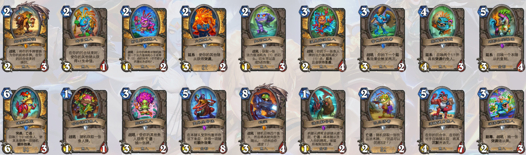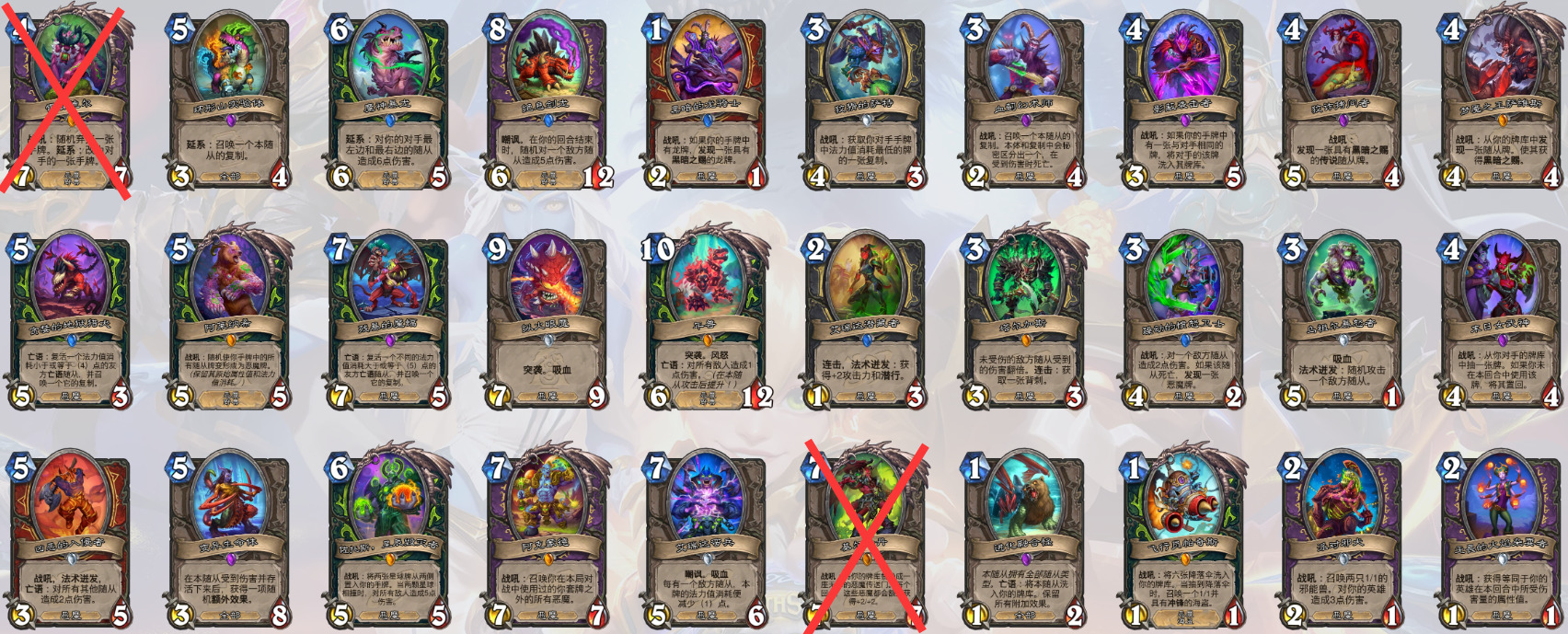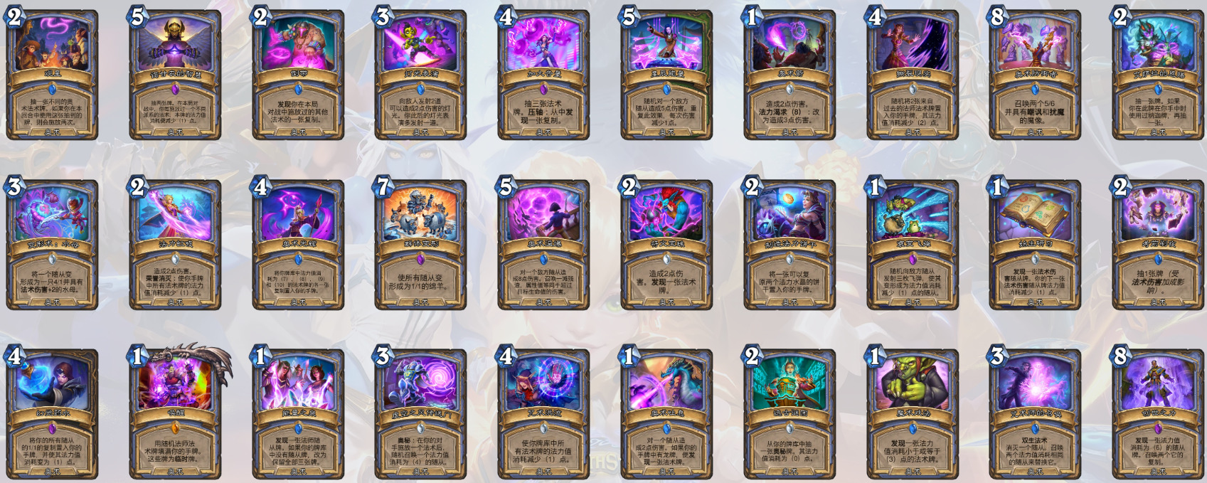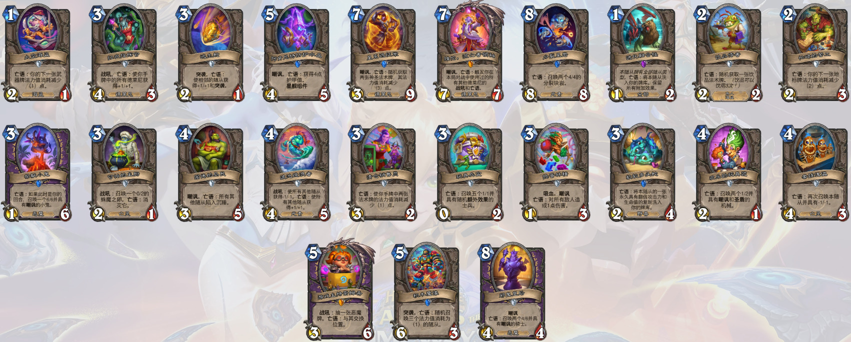 4费:共54张,比较好的牌有时光循环者托奇、黏团焦油、狡诈拷问者、振翅守卫、梦魇之王萨维斯、沙滩塑形师蕾拉、随行肉虫、诚信商家格里伏塔、戈贡佐姆、霜巫十字绣、恋旧的侏儒、折纸仙鹤、套娃傀儡等15张左右,占比约27.8%;