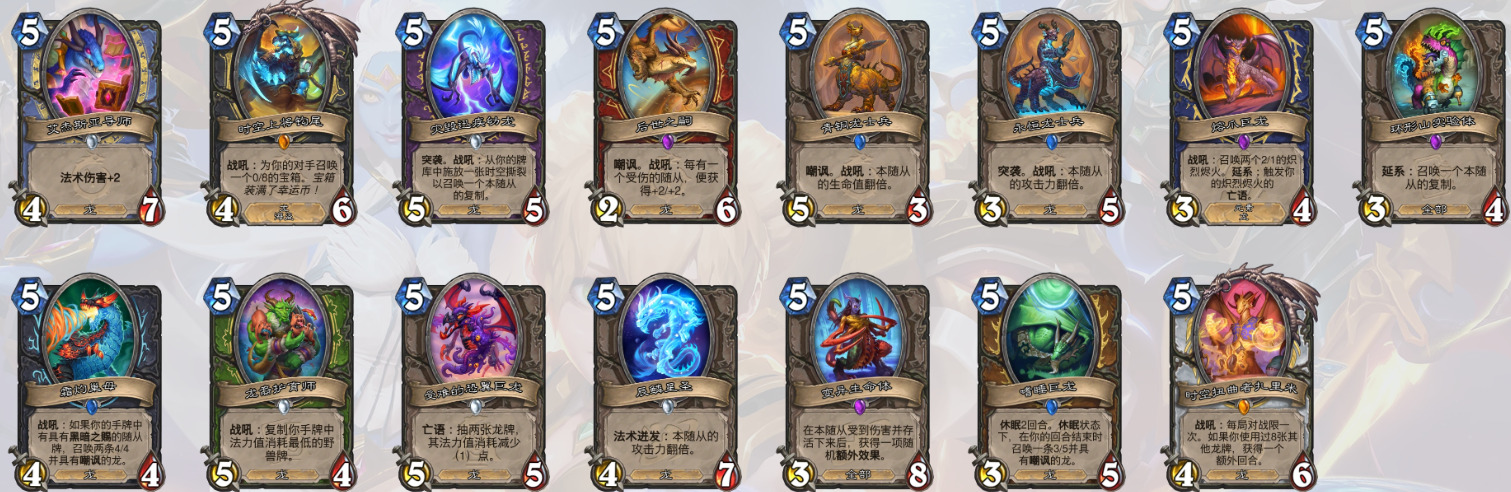 5费:共37张,比较好的牌有永恒龙士兵、祭礼之舞、小精灵驾驭者、大主教哈塔鲁、昔时古树、变异生命体、湾鳍健身鱼人、滑冰元素、折纸青蛙、积木魔像等10多张,占比约29.7%;