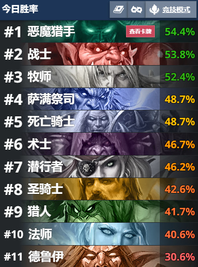 截至11月5日12点各职业地下竞技场胜率排行表:(数据来源:hsreplay官网)